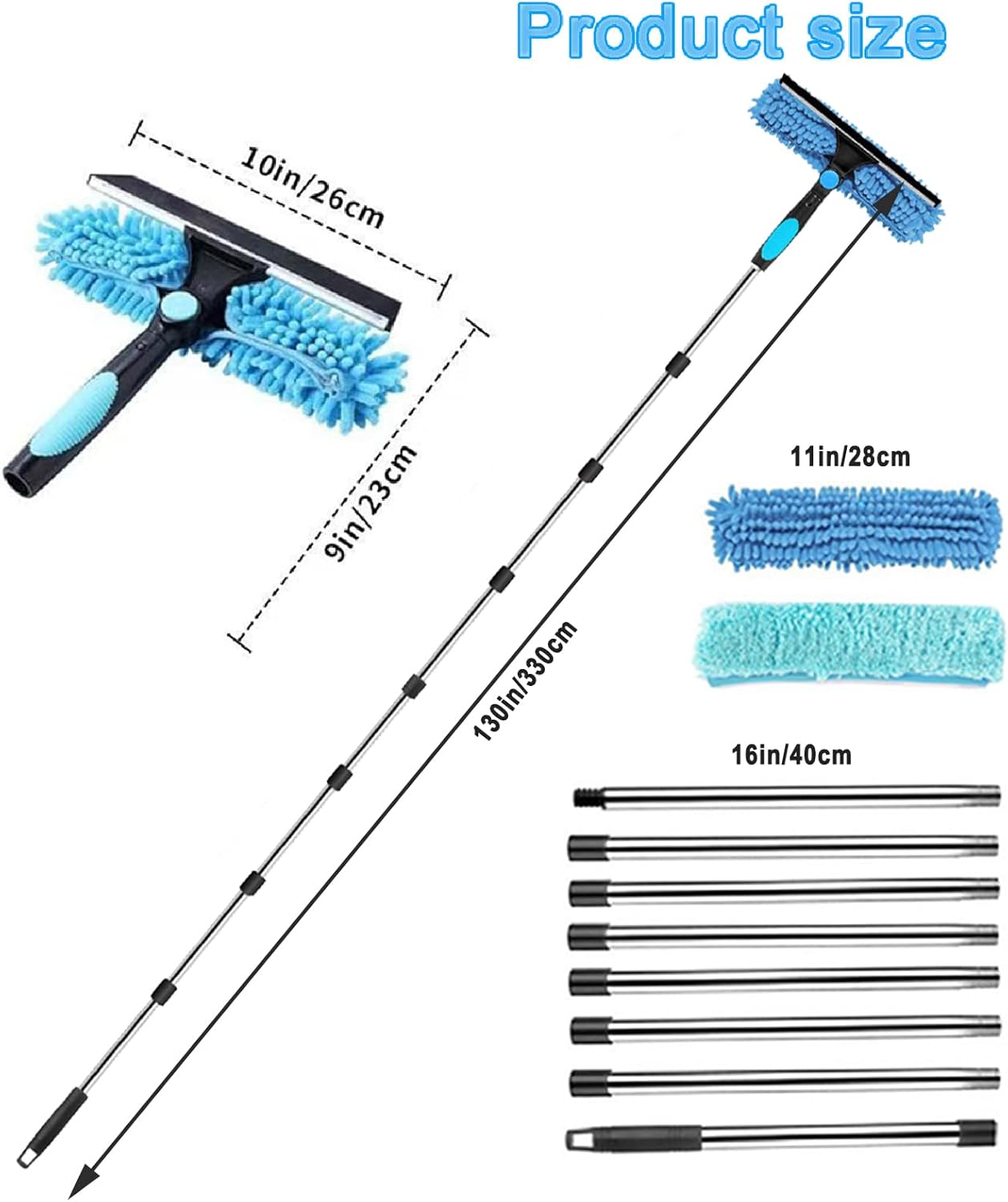 130IN Long Window Cleaning Brush: Extendable window washing brush features 3.3m stainless steel pole,very stronger without any wobble during operation,making it easy to reach up to the top of the window,without the extra ladders or stools,Safe and convenient.