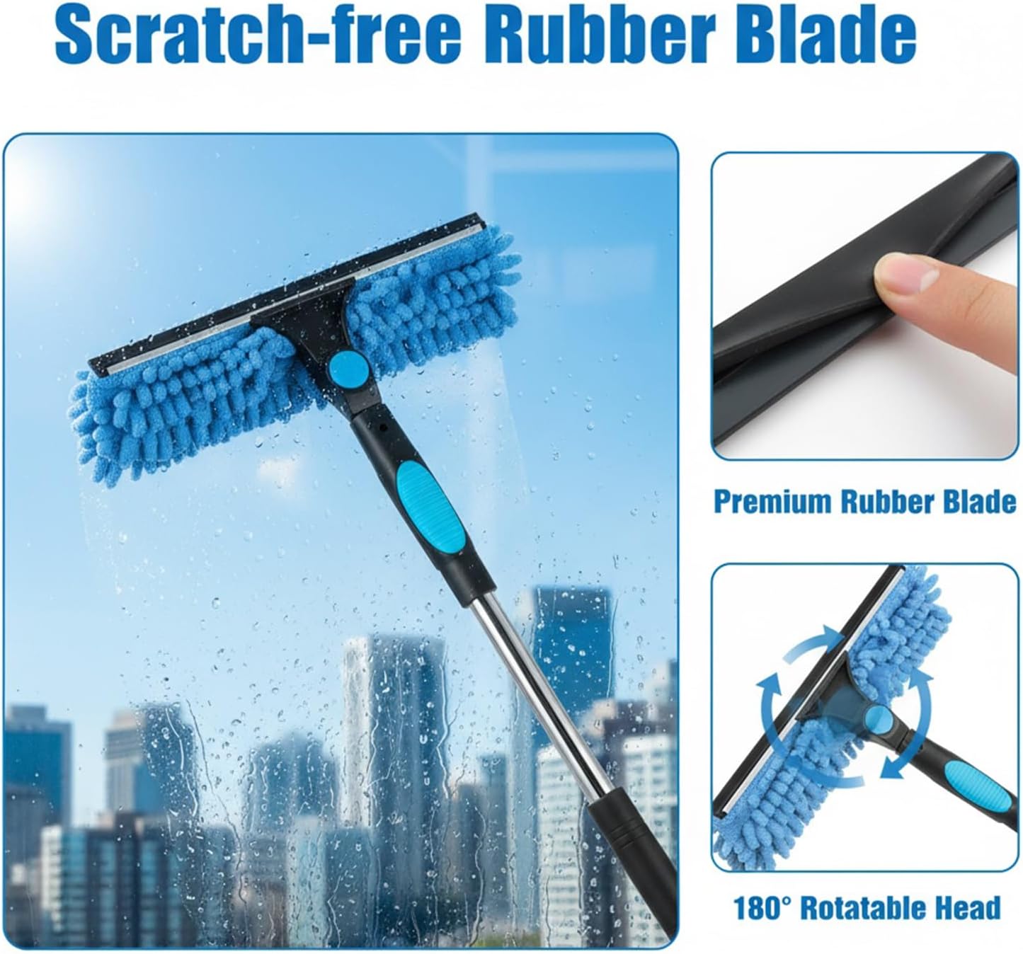 & Free ShippingProfessional 2 IN 1 Window Cleaning Kit: Our extra long window cleaning pole with microfiber scrubber and the 270° rotating head allows easy access to hard-to-reach corners.efficiently washing your high and low windows.Made of natural silicone,width 10IN,soft and firm,can better remove water and soap marks on the windows.