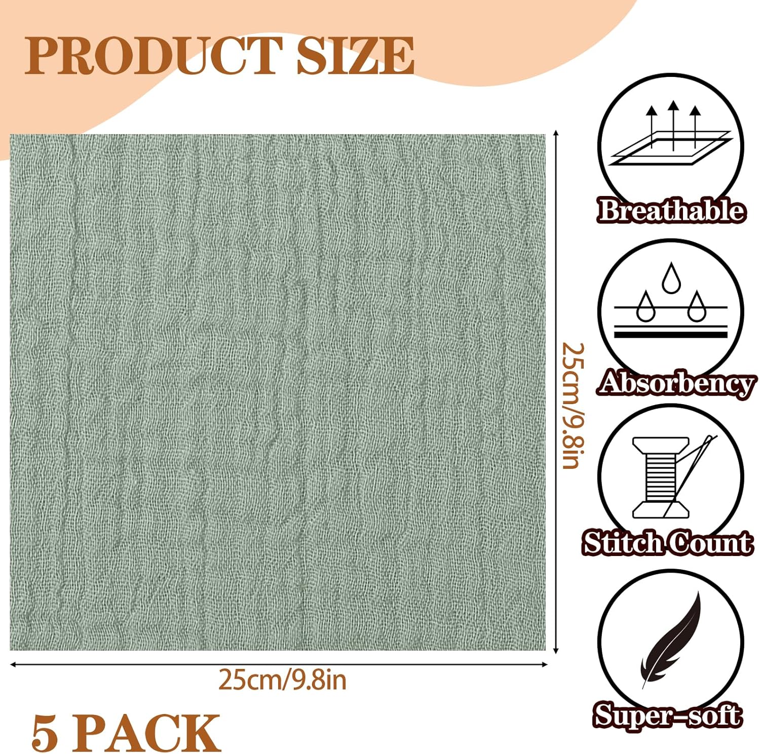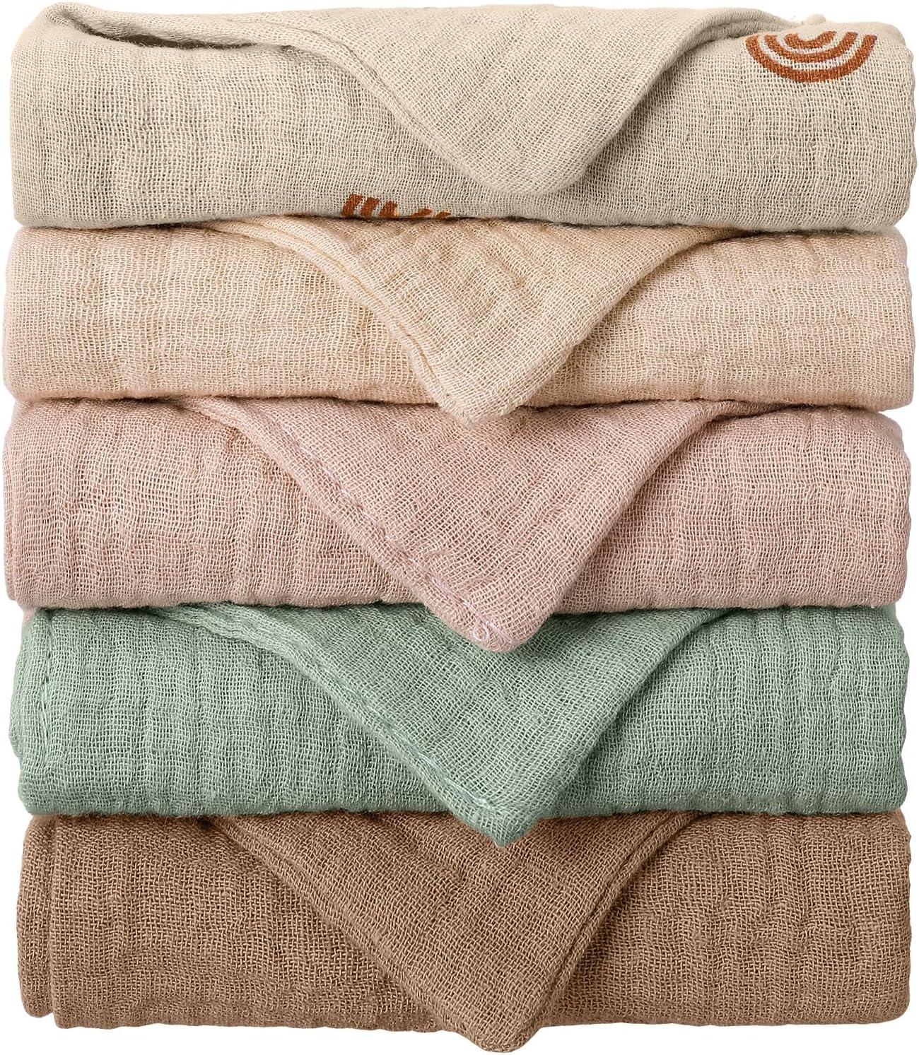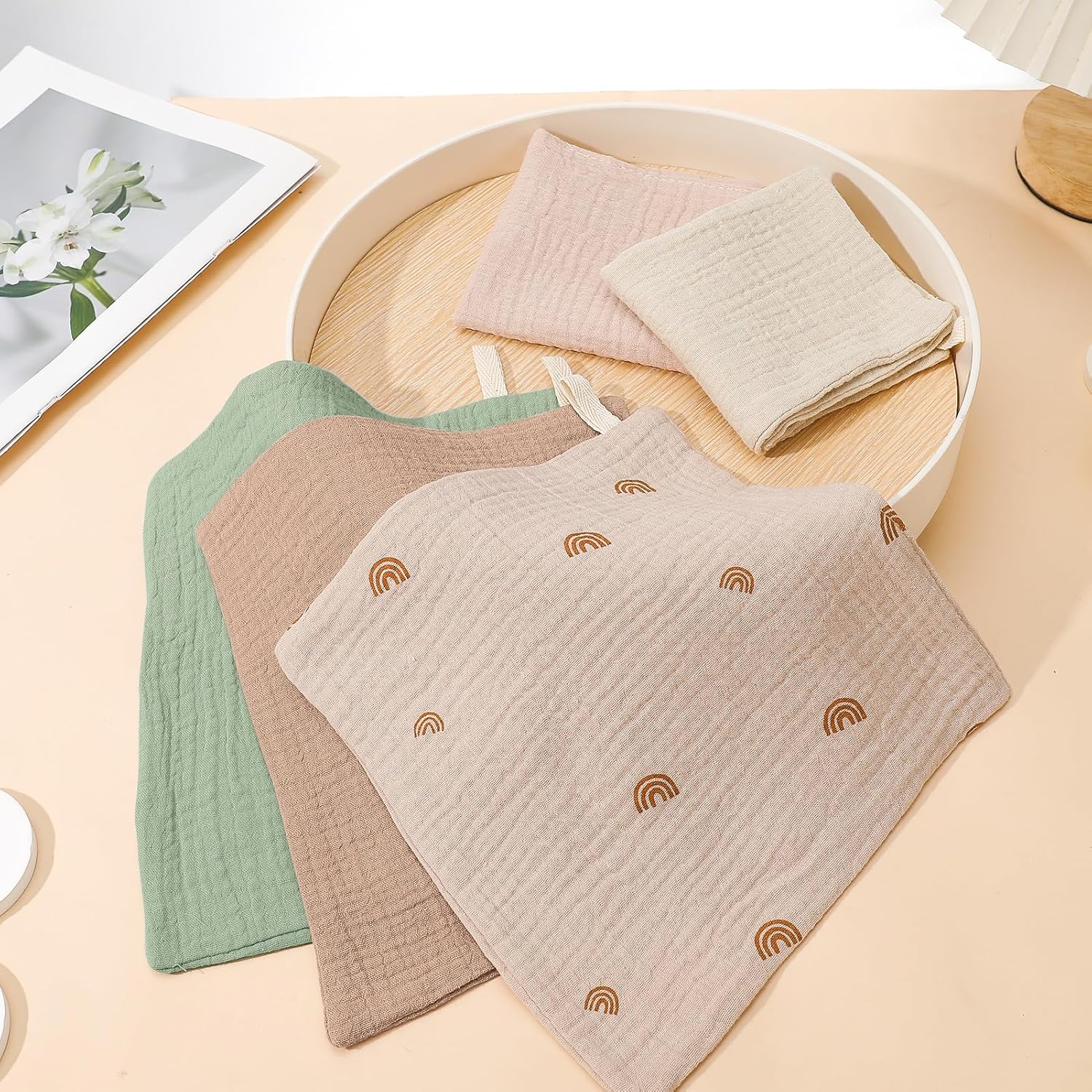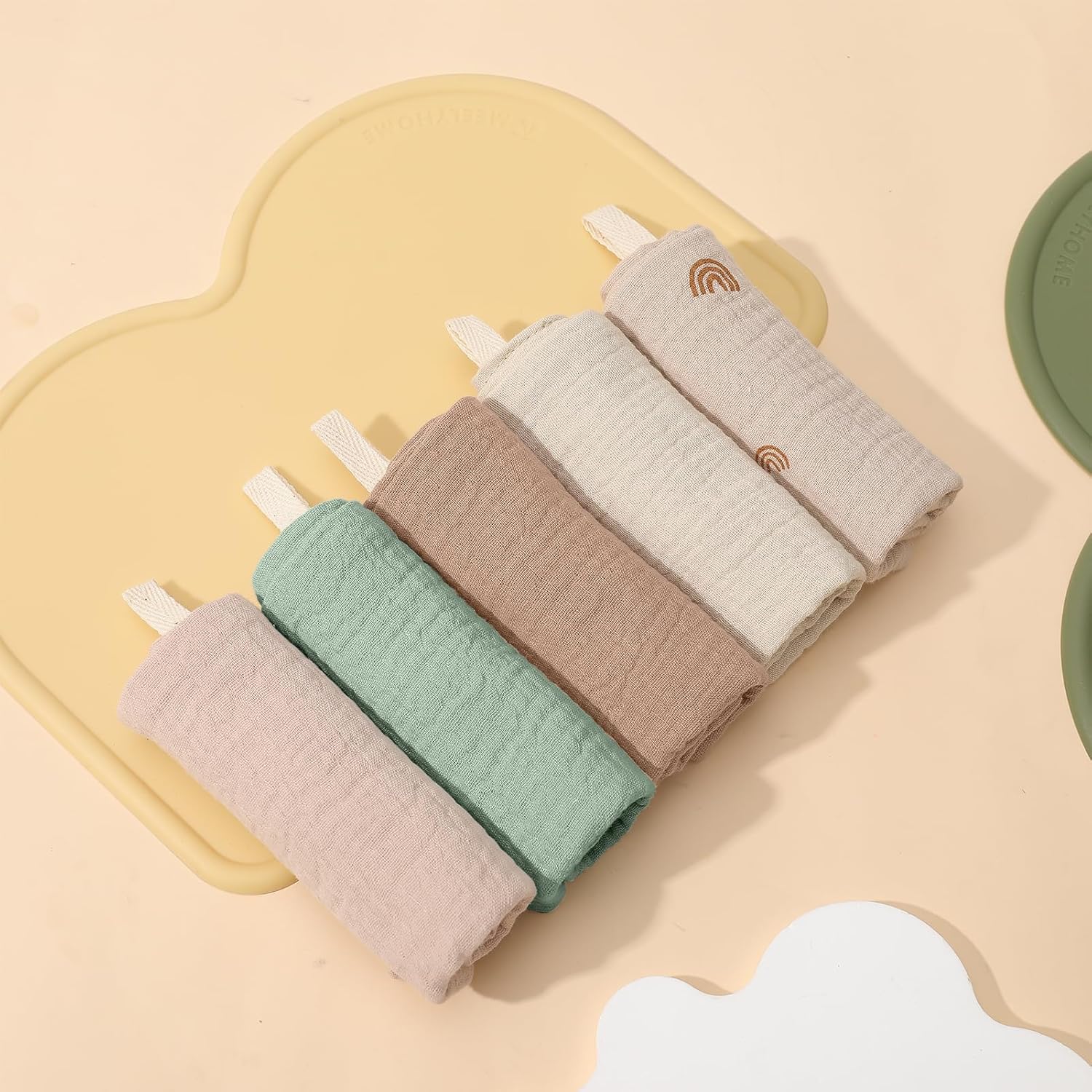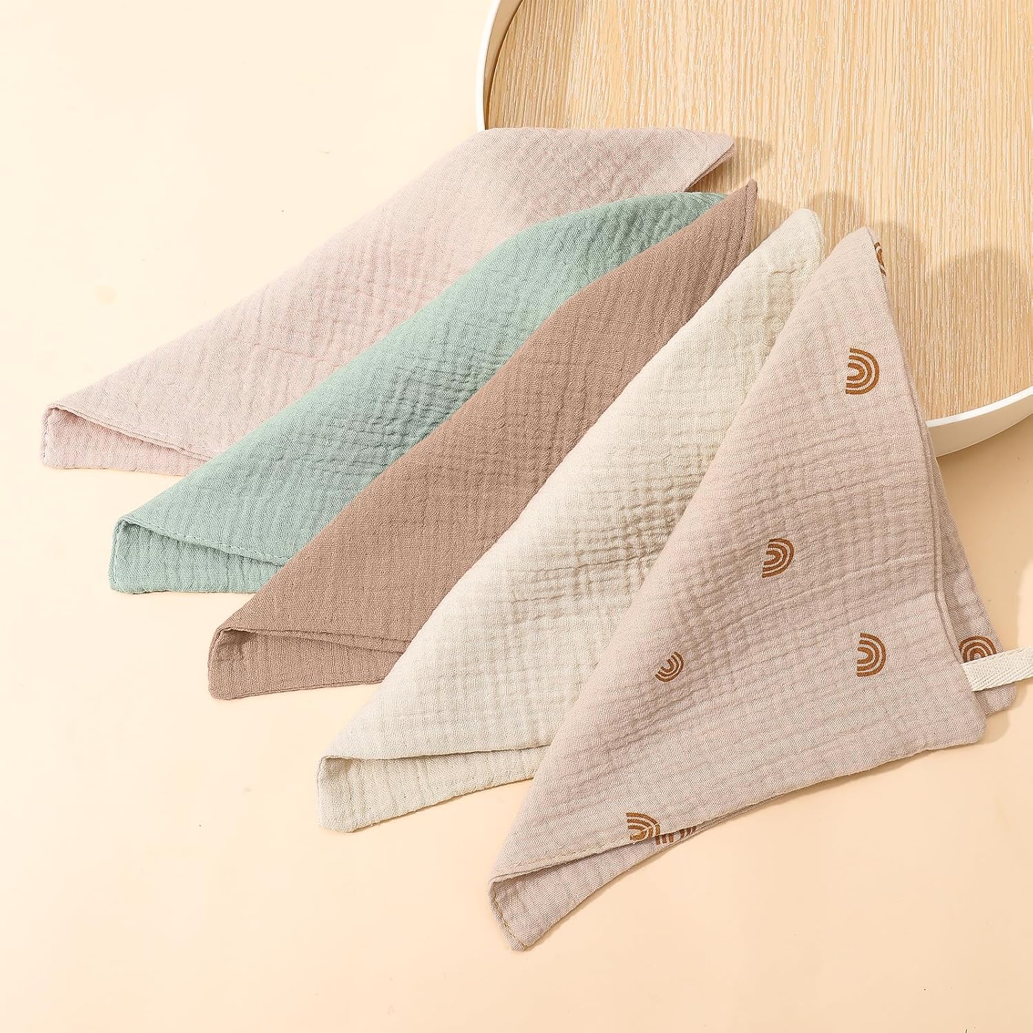 Set: Contains 5 pure cotton muslin cloths, 5 colors in total, the size is approximately 22×23 cm/8.66 x 9 inches(TIPS: Due to the product is transported in a vacuum, it will be compressed and its size will be smaller when it arrives. It will return to its normal size after being stretched appropriately)