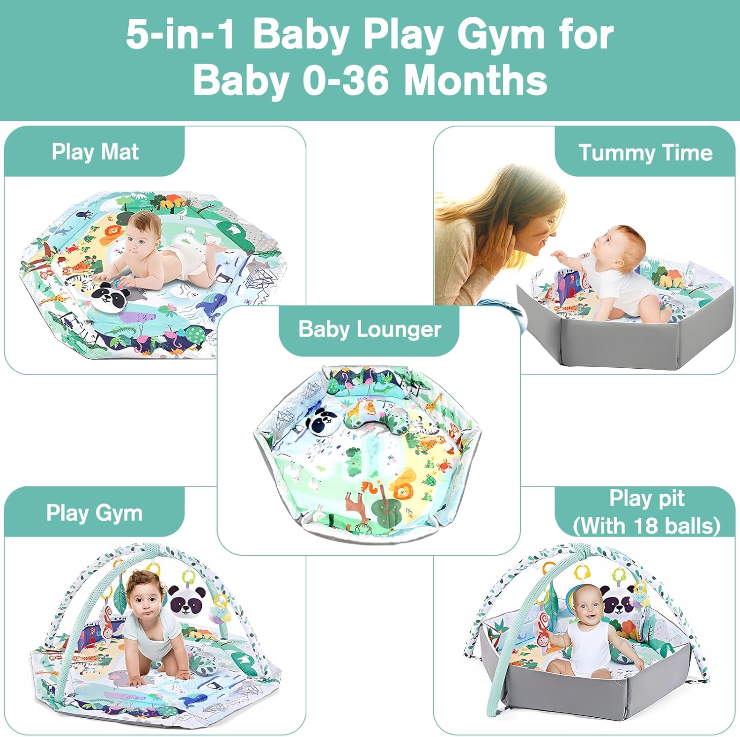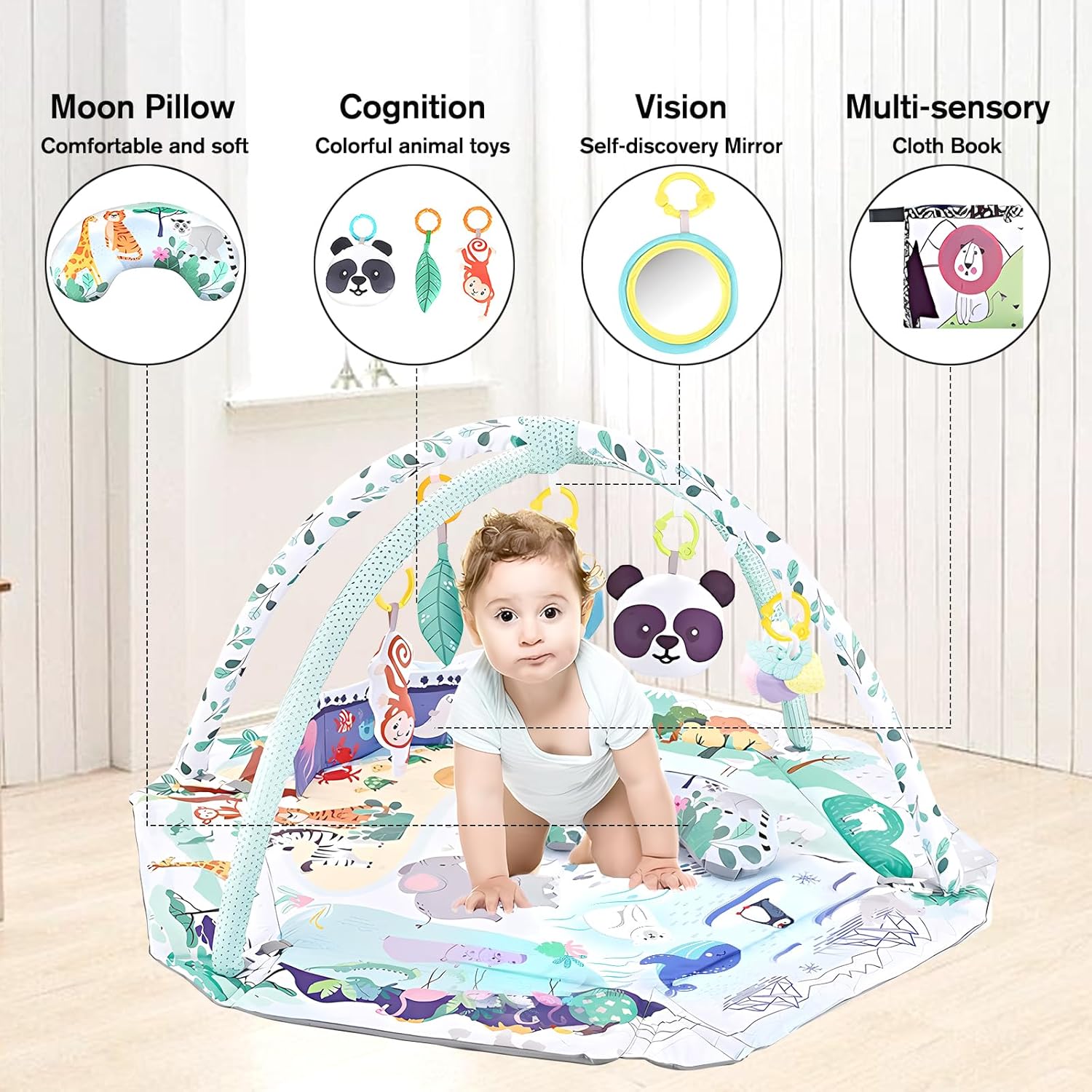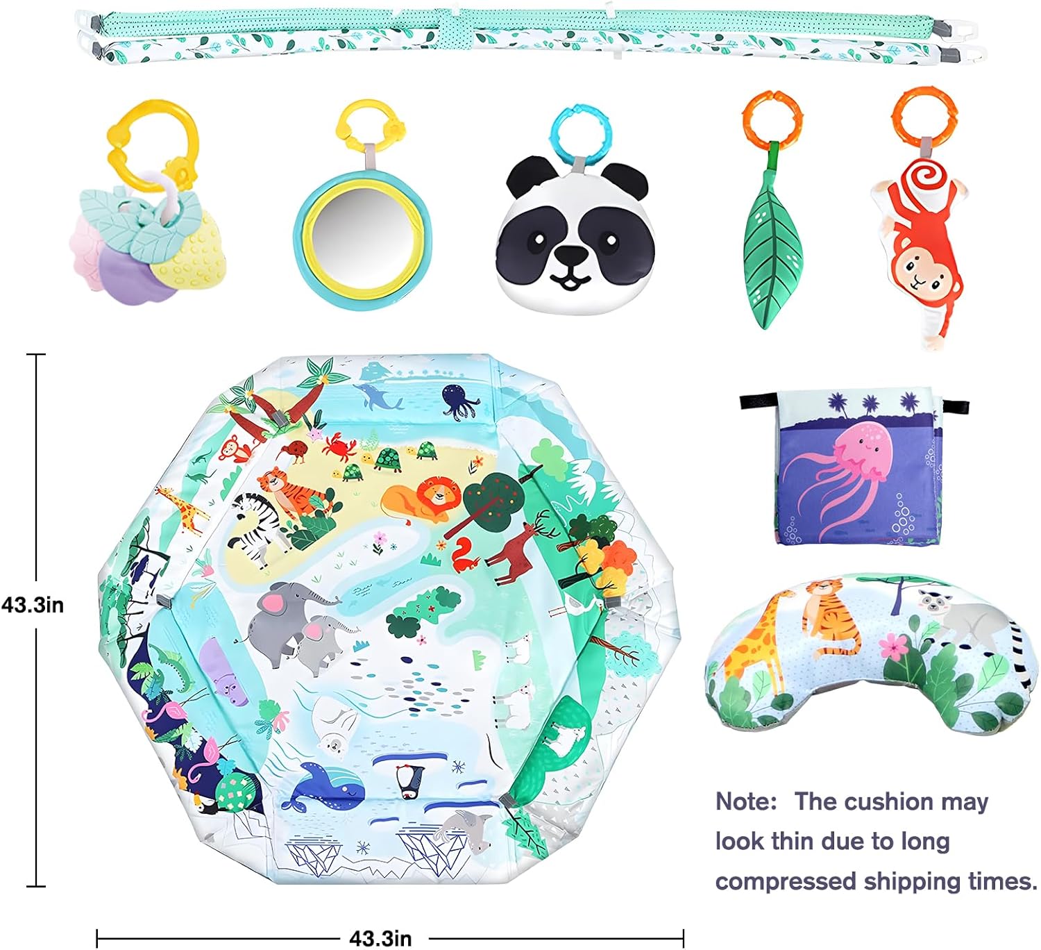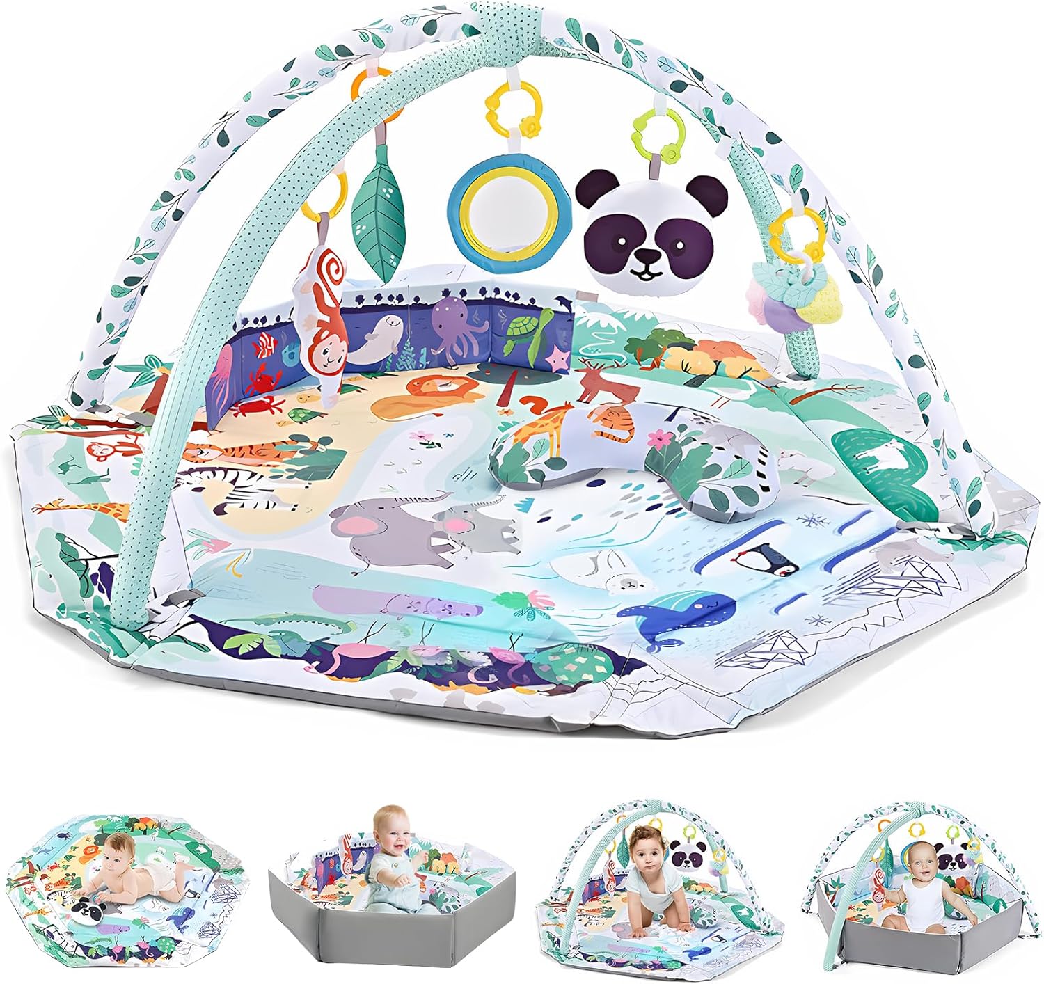 & Free Shipping7-in-1 Baby Activity Play Mat Our forest themed play mat is hexagonal and the main color is light green. It contains 3 fabric toys (panda, leaf, monkey) that make sounds when pressed, a self-discovery mirror, a safety teething ring, a stomach cushion and a book about the sea. It offers different game modes, such as B. Lying down, sitting, prone position and ball games to support babies in the development phase “Tummy Time”.