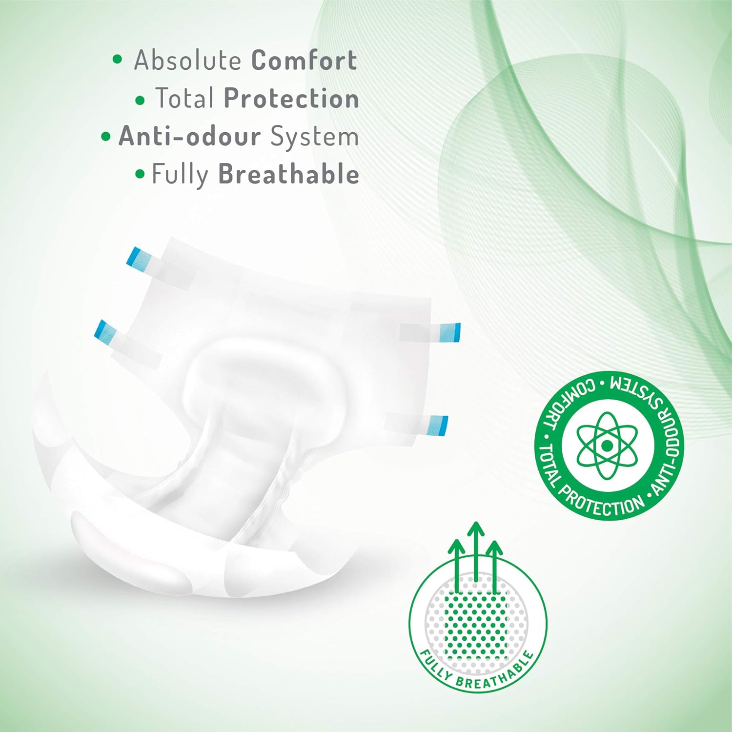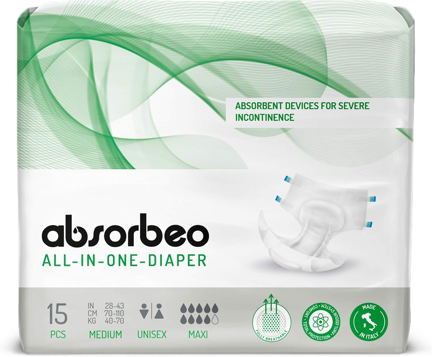 Absorbeo Nappies Maxi Pack of 15, Absorbent Aid for Severe Bladder Weakness, Absolute Comfort, Total Protection, Anti-Odour System, Fully Breathable, Unisex, Size M