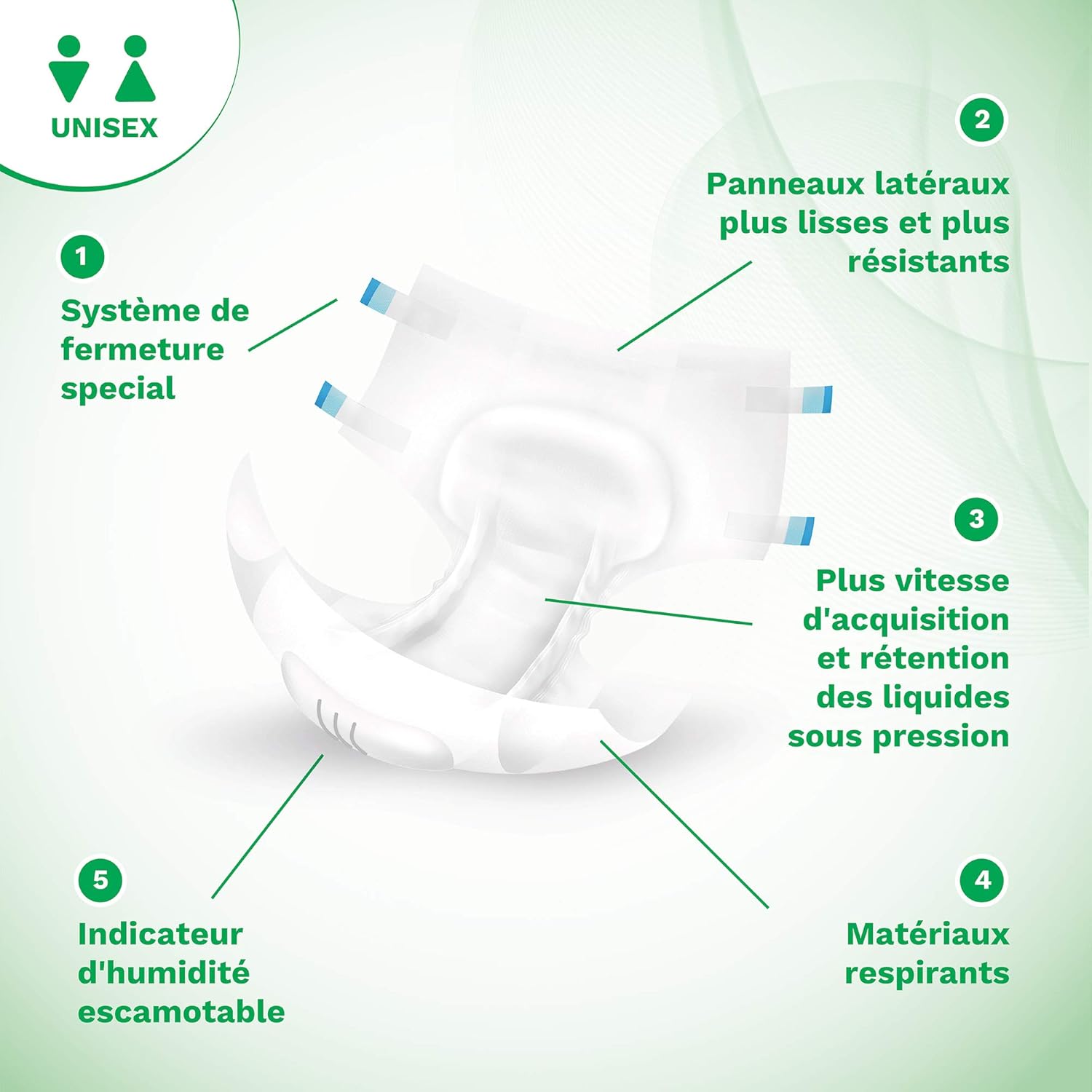 Ultra fast absorption: the nappy absorbs liquids quickly and locks them in the soft material mat, so that the skin stays dry