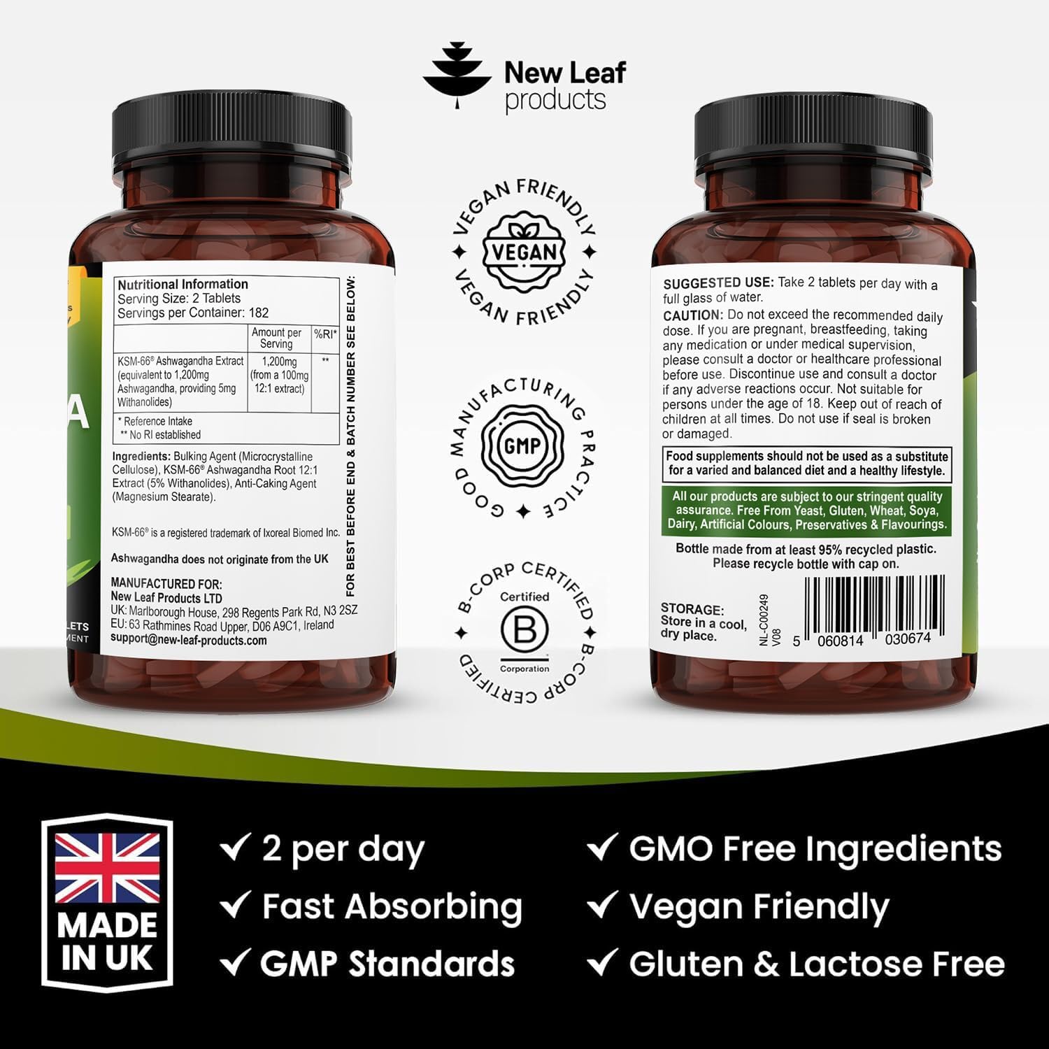 HIGH POTENCY ASHWAGANDHA KSM-66 EXTRACT – Our high strength formula contains 1200mg of ashwagandha KSM-66 root extract from a 12:1 extract. Two easy to swallow tablets per daily serving.