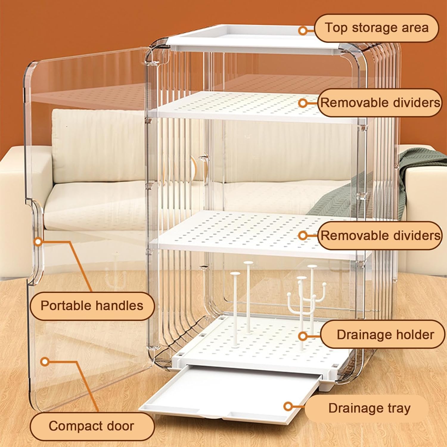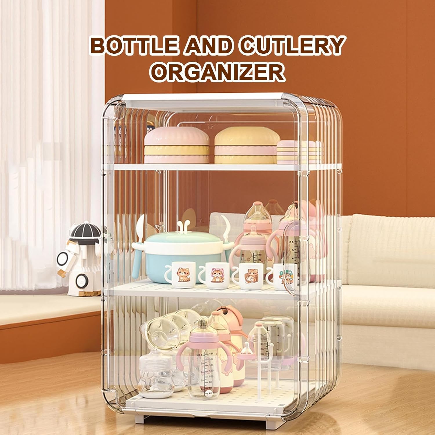 Enhanced Storage System: baby bottle storage Categorized storage is achieved through independent compartments and a vertical stacking layout, creating a spacious and multi-layered solution within a large capacity storage space for organizing baby bottle supplies effectively