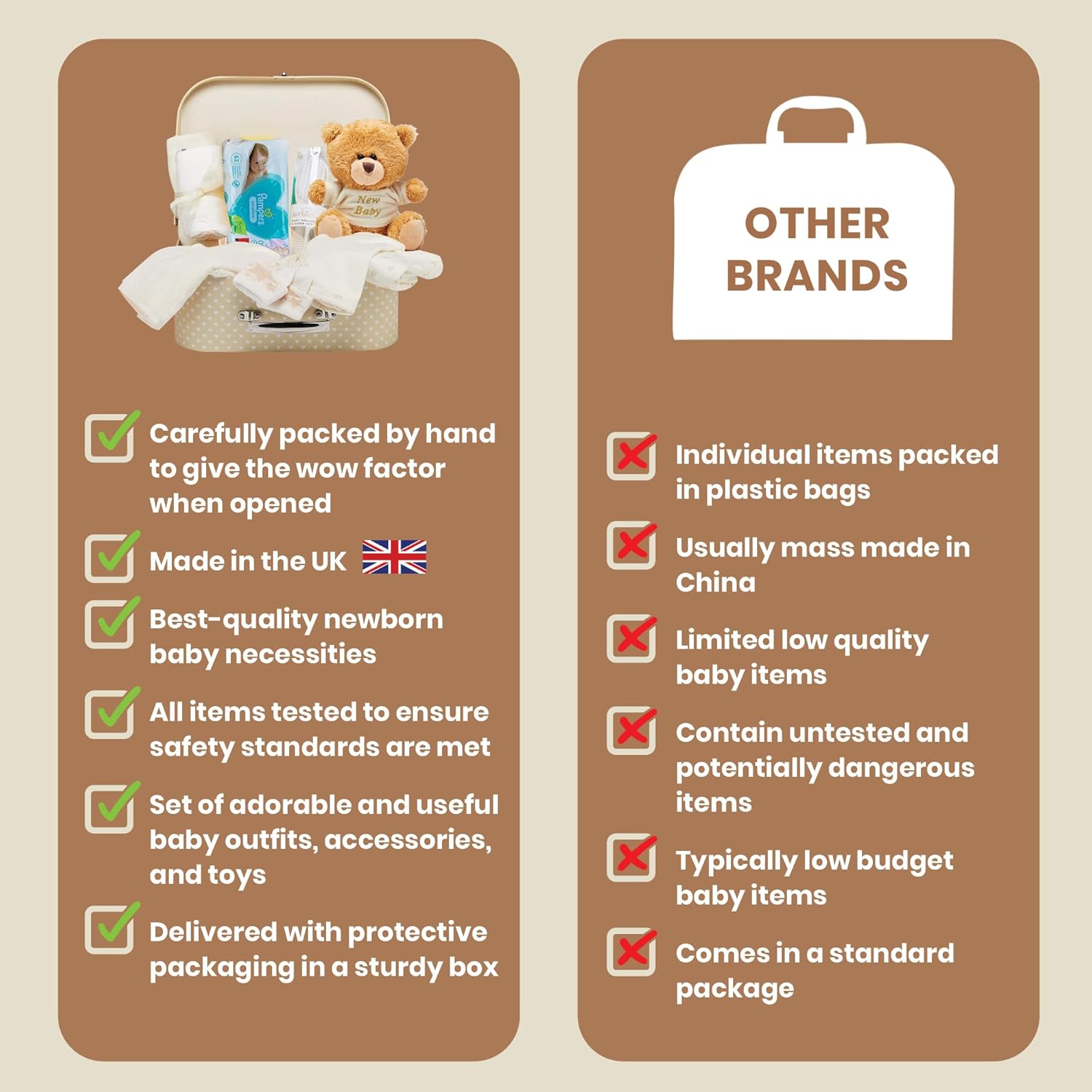 Value for Money: You will not be disappointed at the quality of baby clothes. Includes Cotton Bodysuit,Bib and Socks, Teddy Bear, Swaddling Muslin & Soft Wash Cloth, Baby Bubble Bath, Brush & Comb Set, 2 Nappies and a Keepsake Box