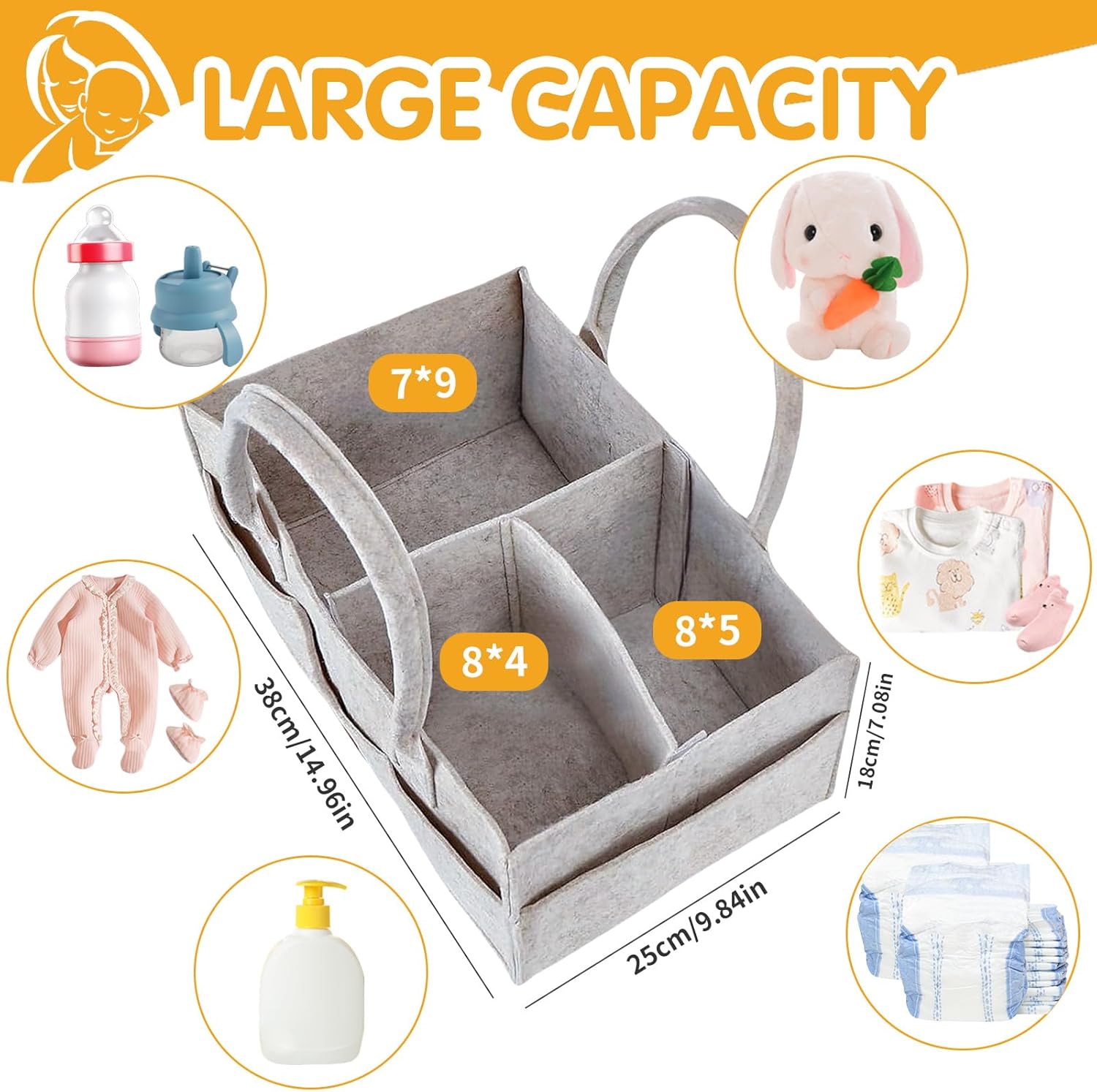 Felt Multi-Functional Organiser Basket:Portable and practical baby diaper caddy organizer fits with high quality and soft felt material, It accommodates diapers, wipes, clothes, toys, changing pads, and more.To meet your needs of different occasions, The Diaper basket with long handles is foldable lightweight and portable which makes it ideal for traveling with kids.