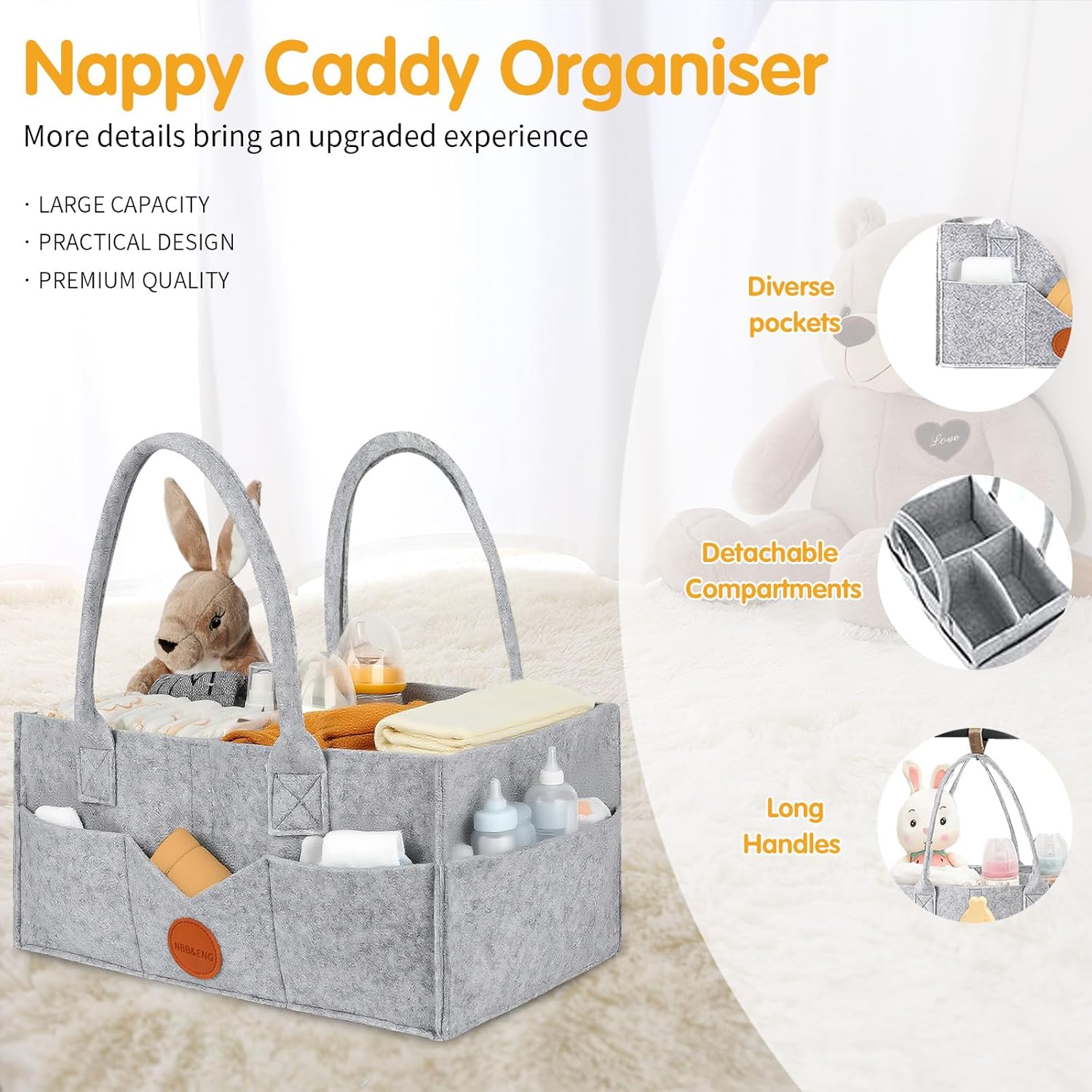 Baby Essentials for Newborn Nappy Caddy Organiser, Baby Shower Gifts with Long Handles Detachable Compartments, Essentials Nappy Bin Nursery Diaper Organizer, Portable Nursery Storage Basket (grey)