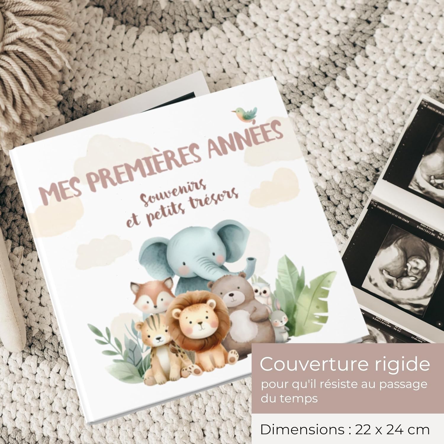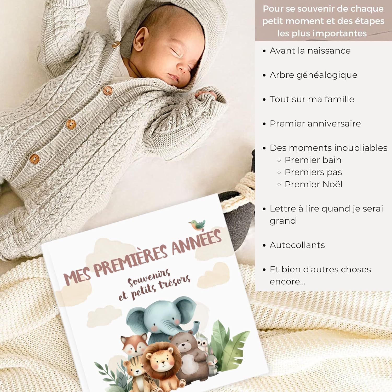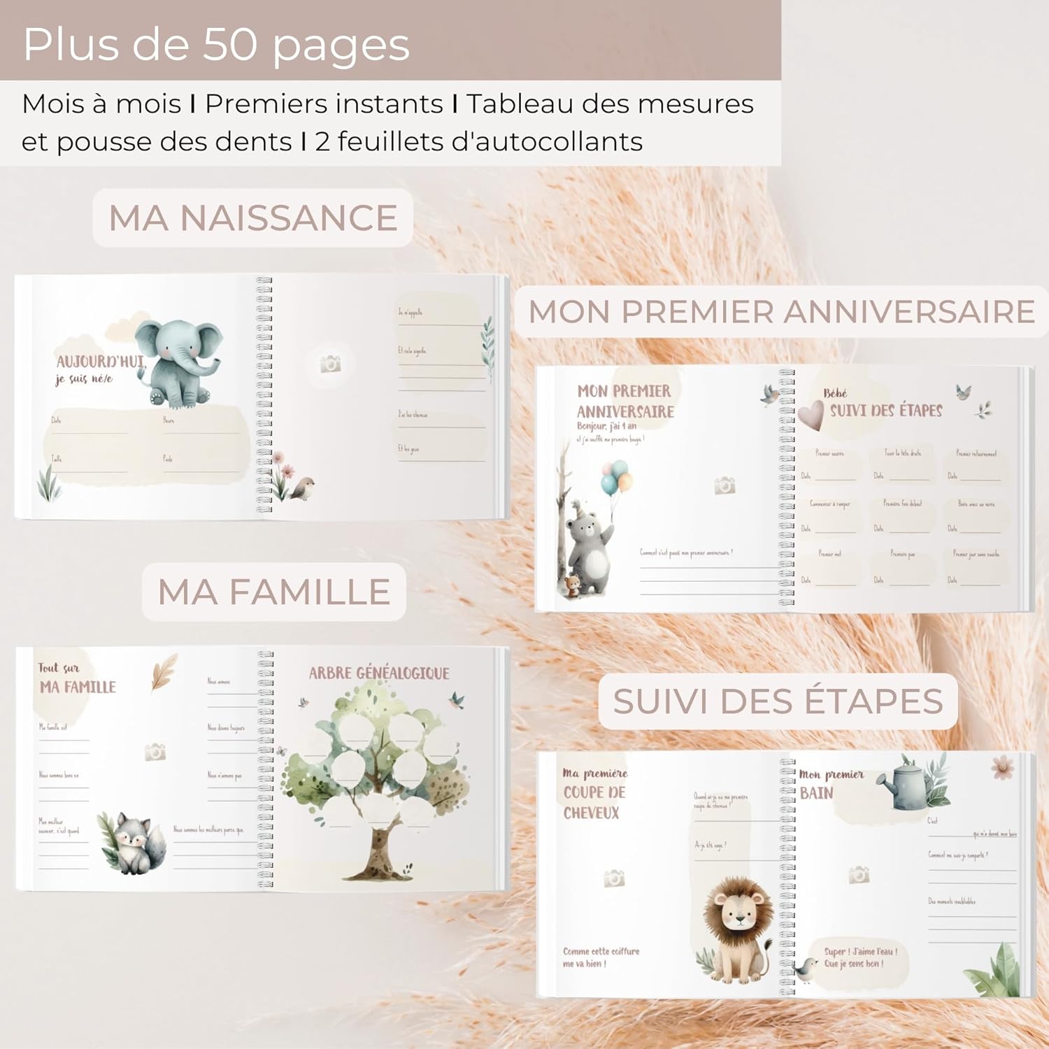 📖 SECTIONS INCLUDED IN THE BABY BOOK 📖 Before birth (family tree, pregnancy album, baby shower); Baby journal month by month (birth, coming home, nursery, first visits/bath); First year (growth chart, first birthday, first steps); First memories (sleep, meals, dental chart, favourite moments); First years (from 2 to 5 years) (annual summaries, memories); Letters to read when he/she is older.