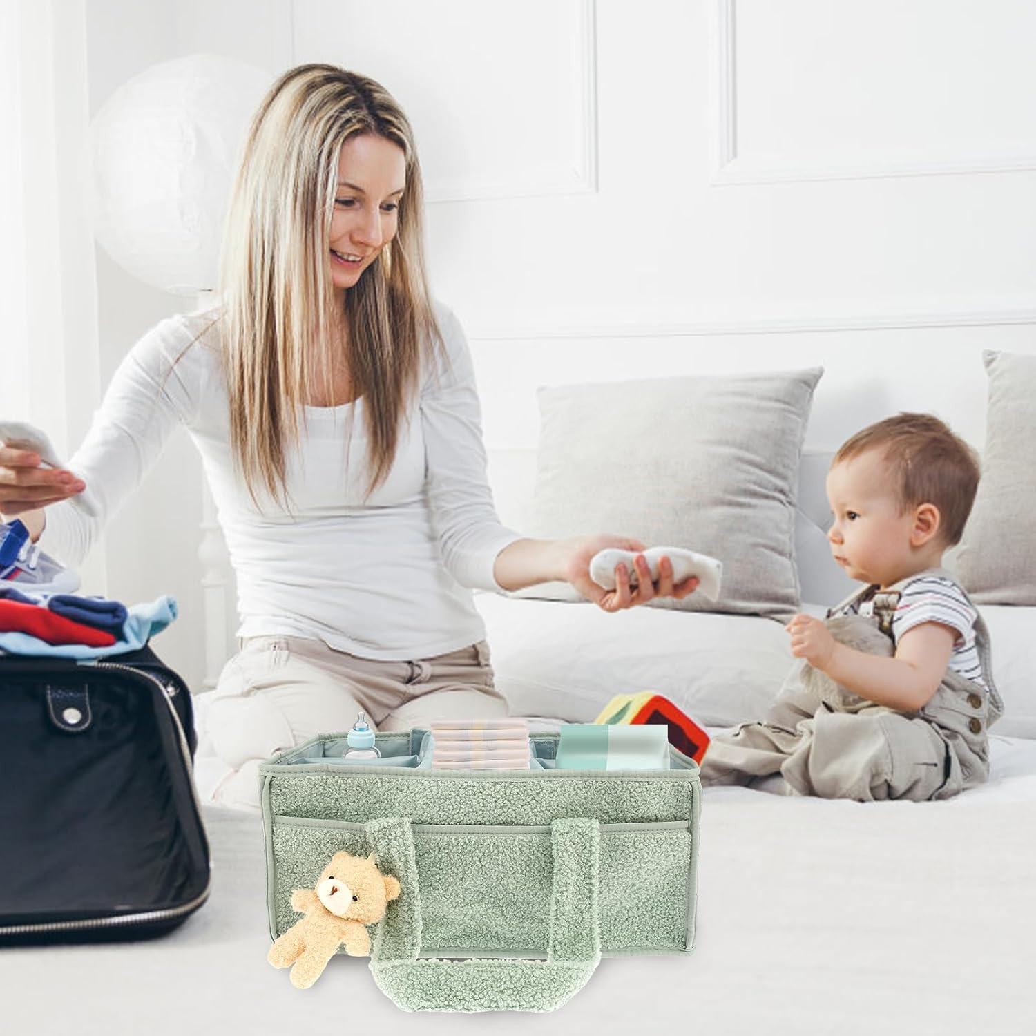 Stylish Diaper Caddy Organizer: Practical and stylish, our diaper caddy organizer adds a touch of style to any nursery or changing table. The soft interior colors create a pleasant ambiance for nappy changing