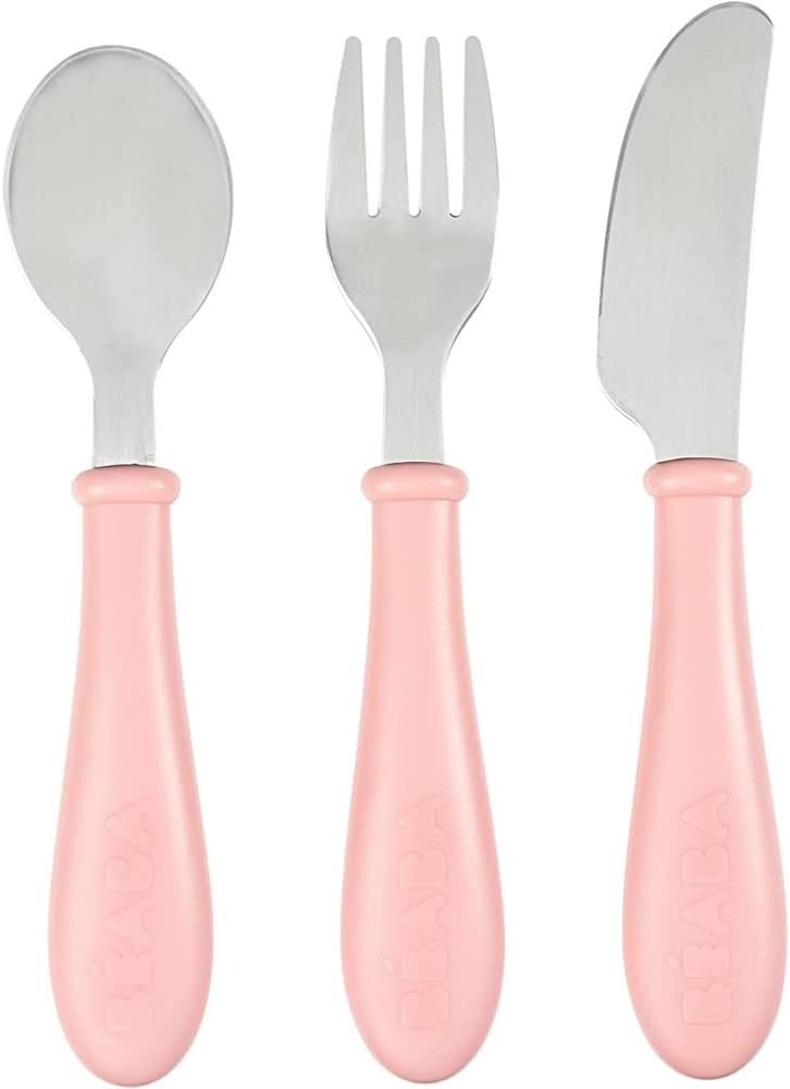 BÉABA, Children’s Learning Cutlery Set of 3 – Stainless Steel – 2nd Age, from 12 Months – Baby Friendly, Pink