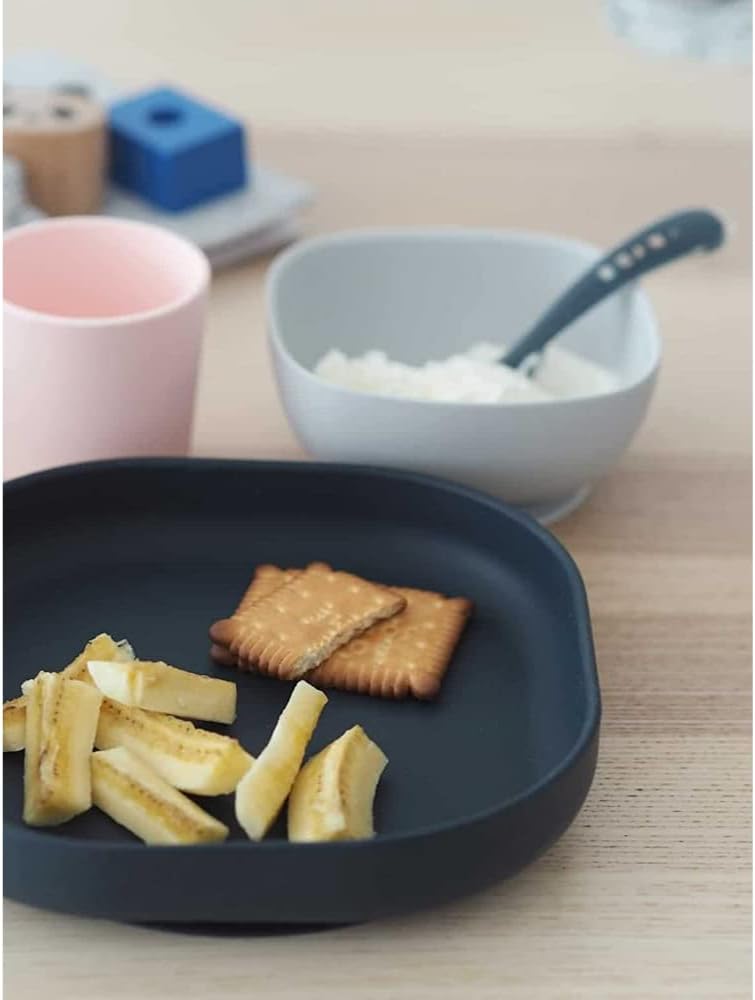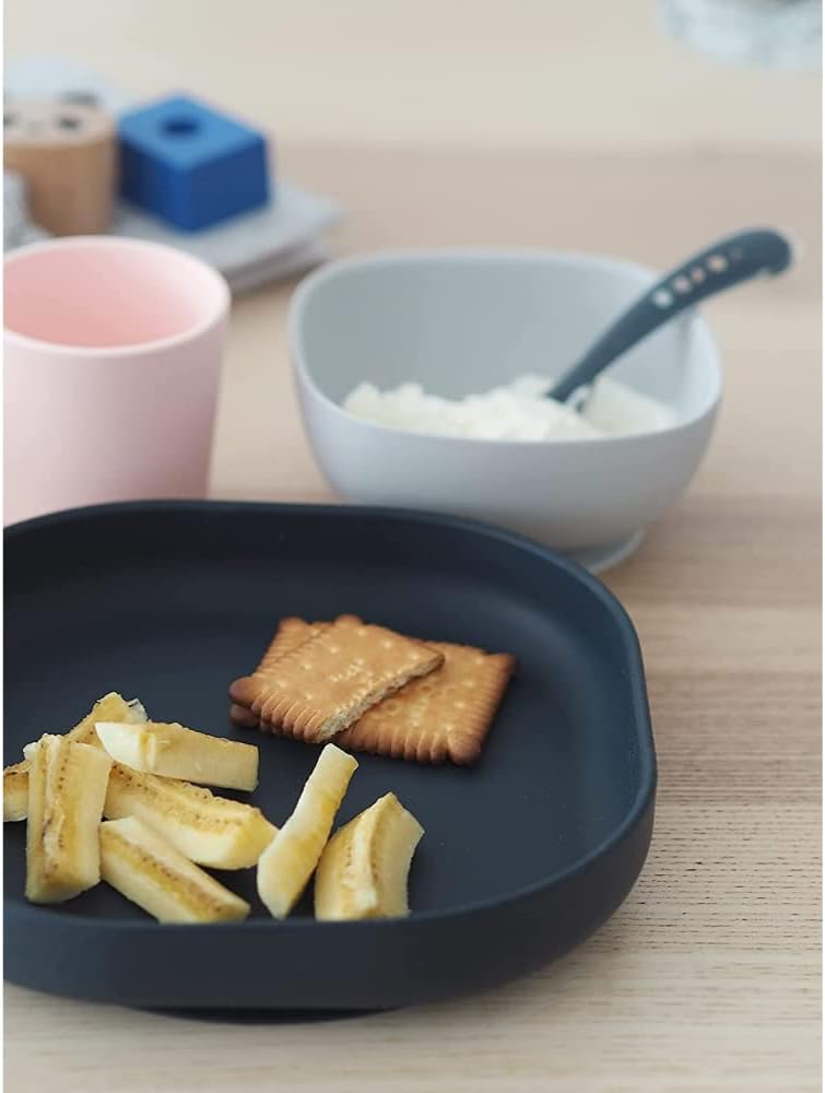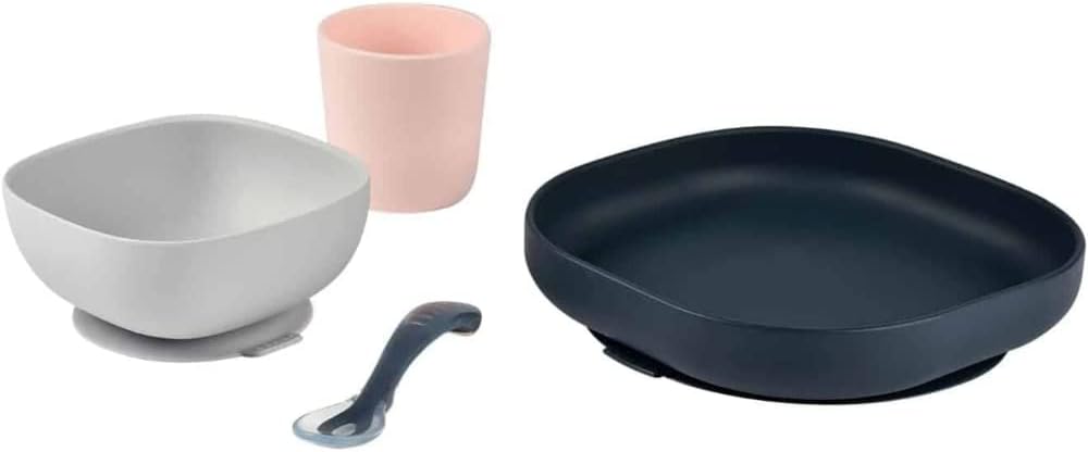 BÉABA, Silicone Baby Dinnerware Set with Suction Cup, Non-Slip, 4 Pieces, Plate + Bowl + Glass + Spoon, Healthy and Durable Silicone, Dishwasher Safe, Microwave, Night Blue