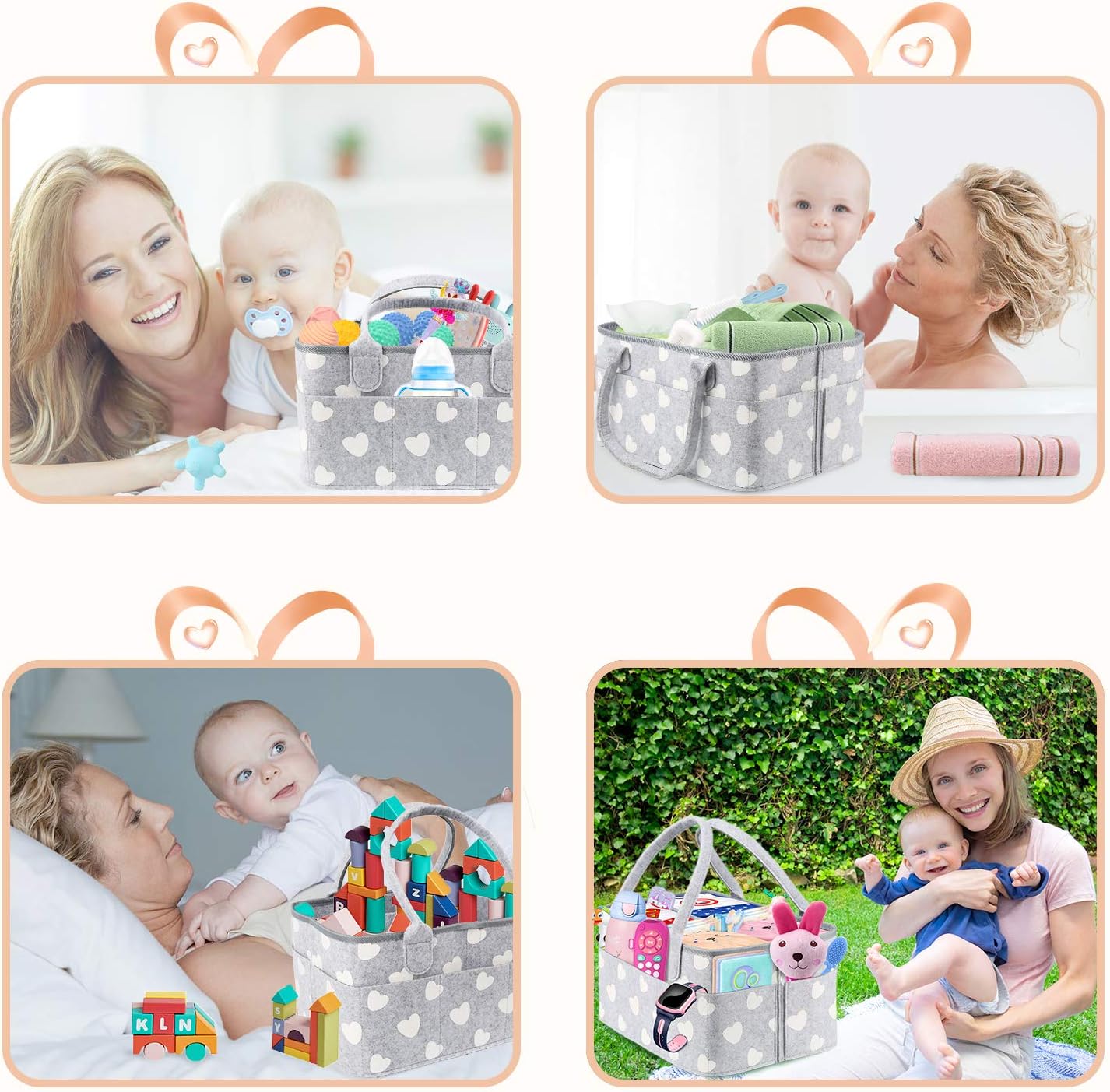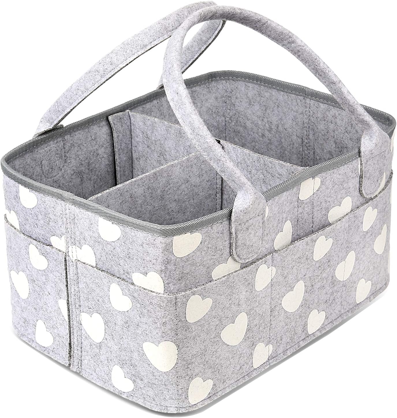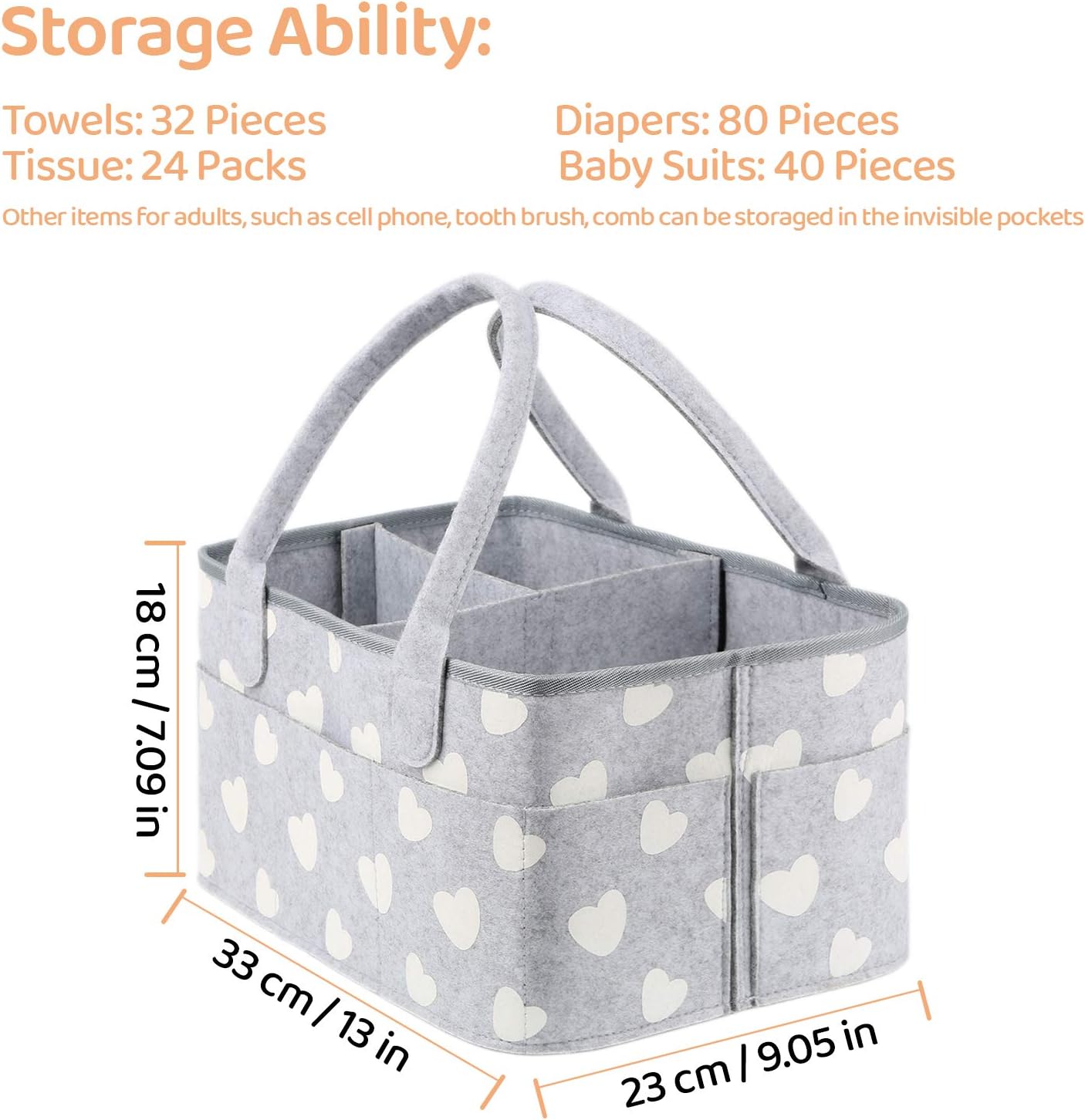 【 Easy to Clean】 The diaper caddy printed with stylish heart pattern in light gray color to give it a stylish look and make it dirt-proof. Do not use washing machine to clean the storage basket, it will damage frame, just put it sometime in water and liquid soap then brush away the dirty area lightly.