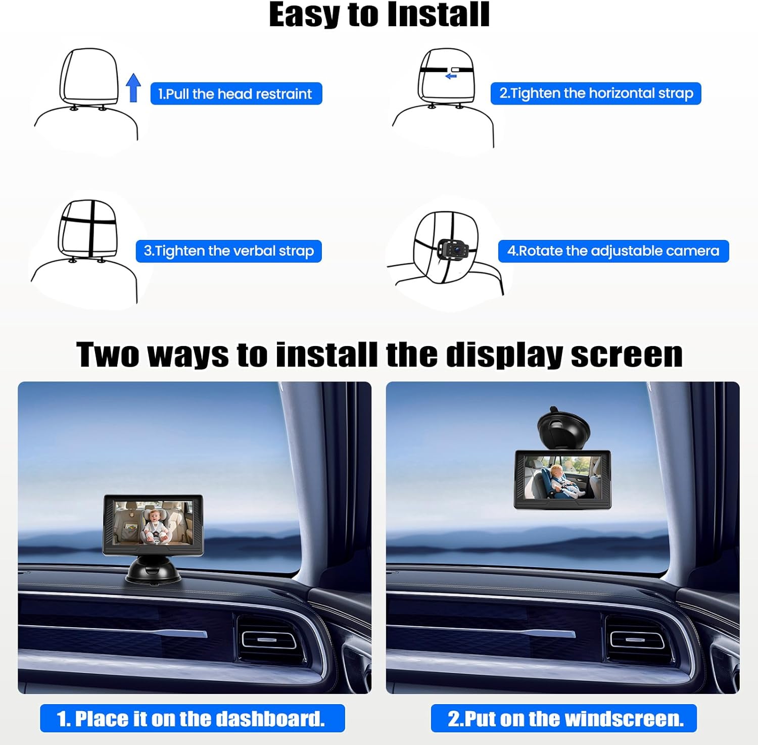 UNIVERSAL VEHICLE COMPATIBILITY Whether it is a small car, an SUV, a van or a pickup truck, the camera can be attached to most headrests. Ideal for family trips, carpooling or the daily commute to work. It is also suitable for grandparents or nannies who transport the child occasionally.
