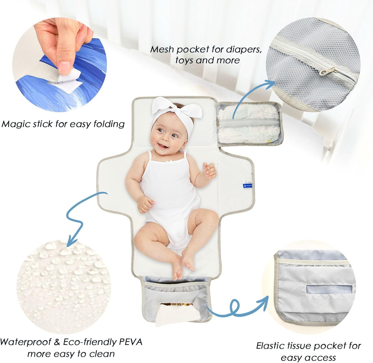Travel Changing Station Turn any room into a portable changing station with these baby pee pads. The waterproof changing mat blocks leaks instantly, perfect for airports, cars or public toilets. It fits comfortably in our wet bags for hassle-free travel.
