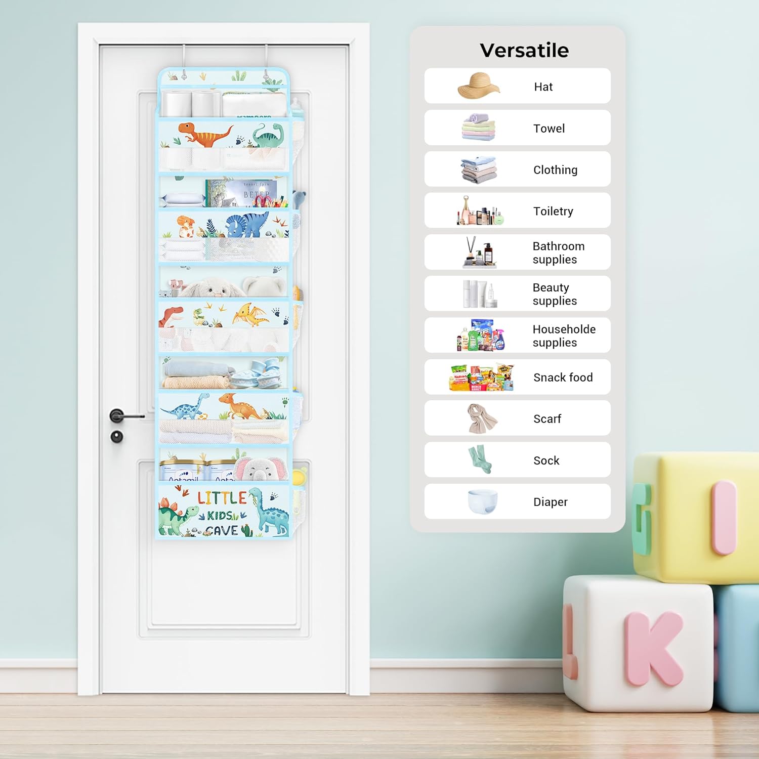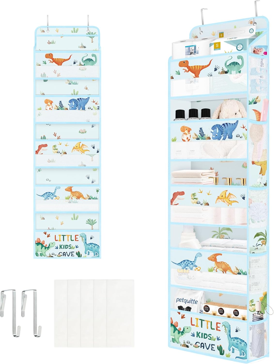 Clastyle Blue Dinosaur Over the Door Organizer with 5 Pockets Nursery Hanging Storage Organizer for Kids Clothes Diaper Toy Claws Cave Closet Door Hanging Shelf Storage for Bedroom Bathroom Pantry