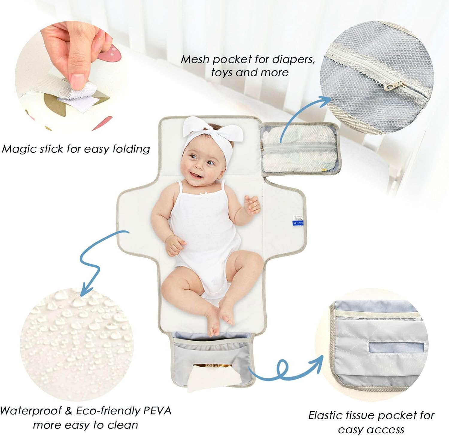 CONVENIENT TO USE:Attaches to stroller or diaper bags with the snap closure. The foldable changing mat folds down to 11.8 x 8.5 inches – as light as standard mats and fits effortlessly into wet bags for compact travel.