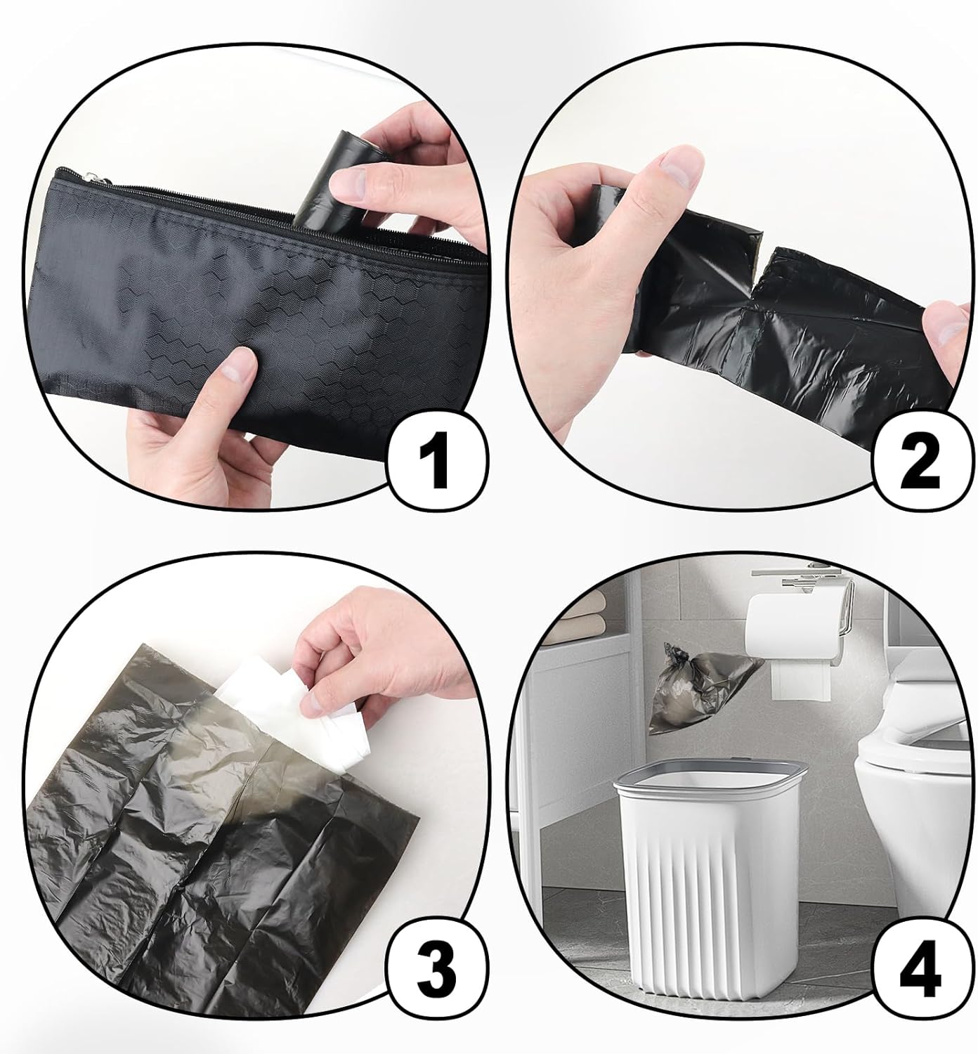 Protect Privacy and Avoid Embarrassment: The disposable sanitary bags can help you dispose of your sanitary products better without shame or odor. Better keep your room clean and tidy without worrying about embarrassing sanitary products in the trash. All you need to do is to put these items into the bag, seal it well and throw it into the trash can