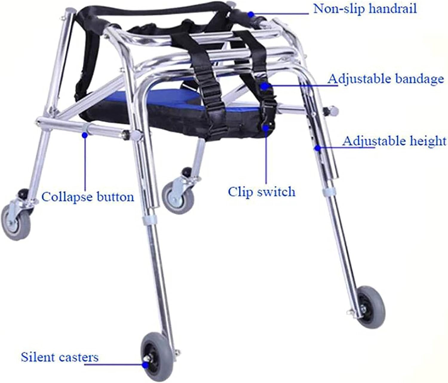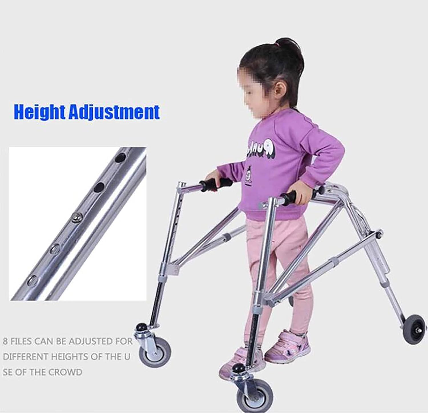 8-speed adjustable height settings make it suitable for individuals of various heights, functioning as a foldable walker for children.