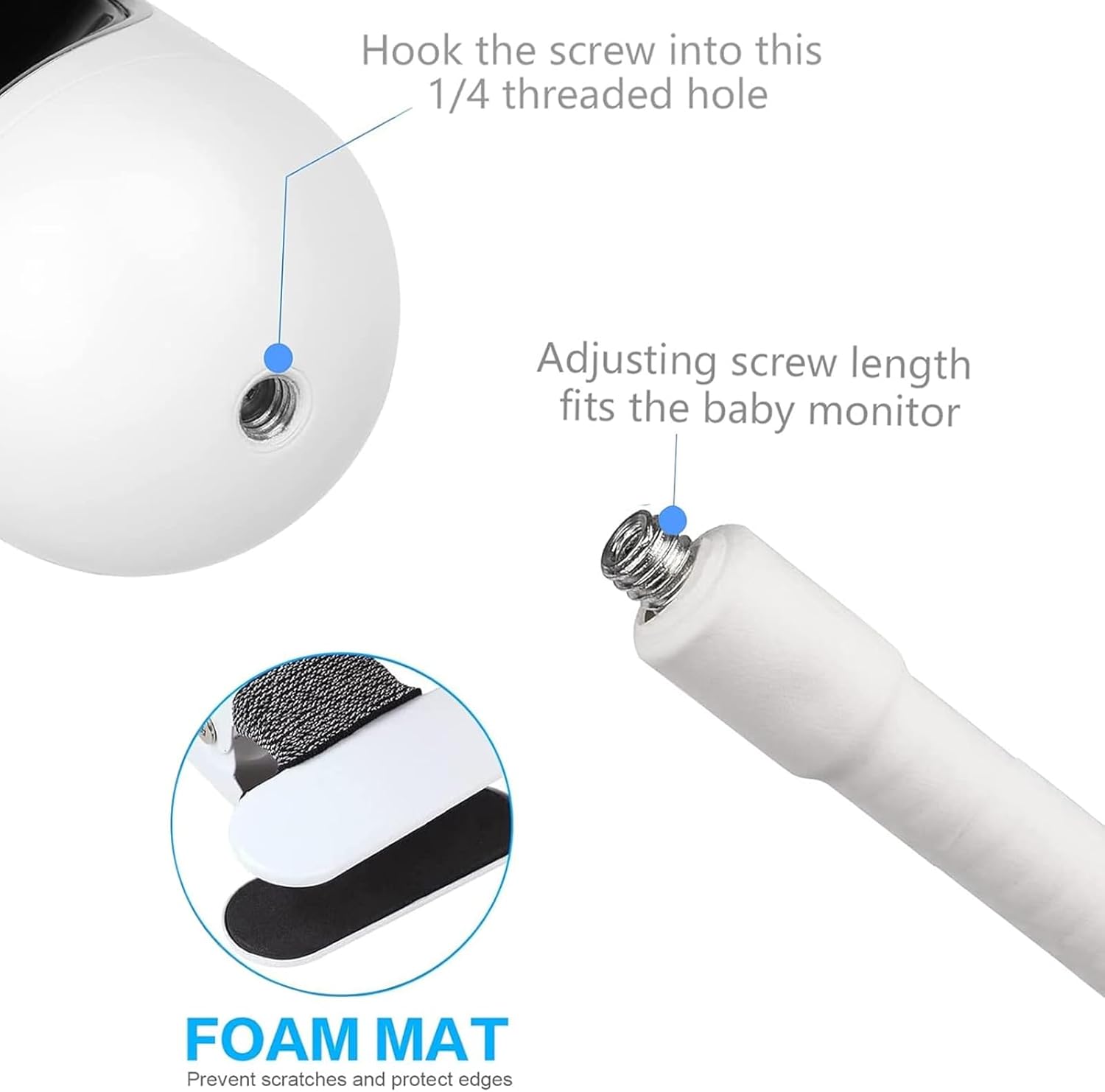 Compatible model: the universal baby monitor holder with 1/4 inch thread is compatible with Momcozy baby monitor (BM01/BM03/BM04), GHB baby monitors (ABM700, ABM720, SM50B, VB807), Boifun baby monitors (Baby 6T, Baby 2S, VB. 805), ieGeek 1T, OBVHNUA 900ES1/900ES2, VTech baby monitor (VM901), Owlet Cam 1 (not for oil) and other baby cameras with 1/4 inch thread base.