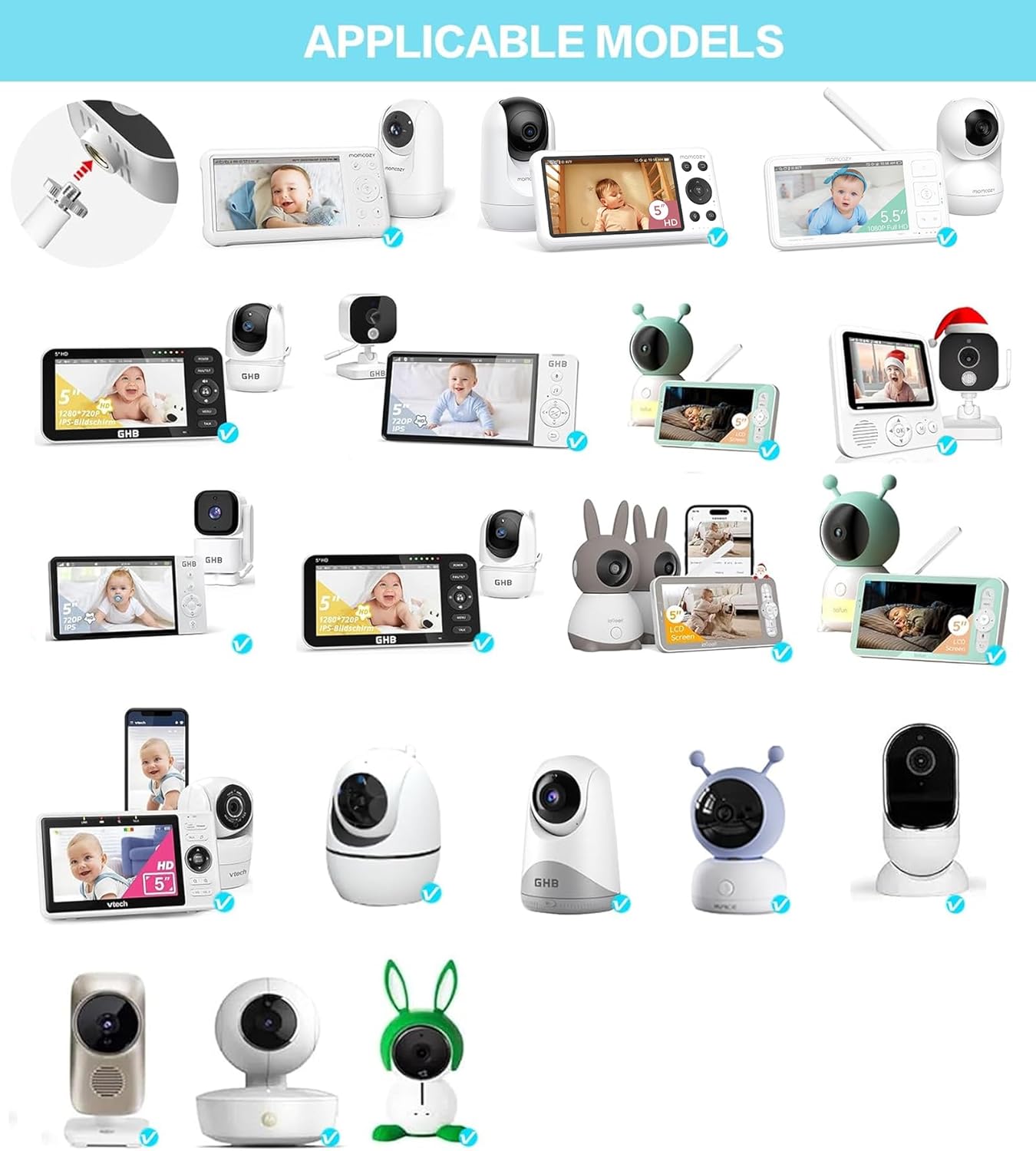 ️【Our universal baby monitor holder is compatible with most baby cameras, including but not limited to – the list below). Please check your baby monitor model before ordering. If you are unsure whether this universal mount is compatible with your camera, please feel free to contact us.