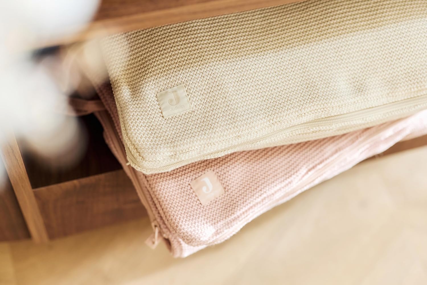 Soft and comfortable: the outside of the footmuff has an elegant knitted structure, while the inside is made of soft coral fleece for cosy warmth and a gentle feeling on baby’s skin