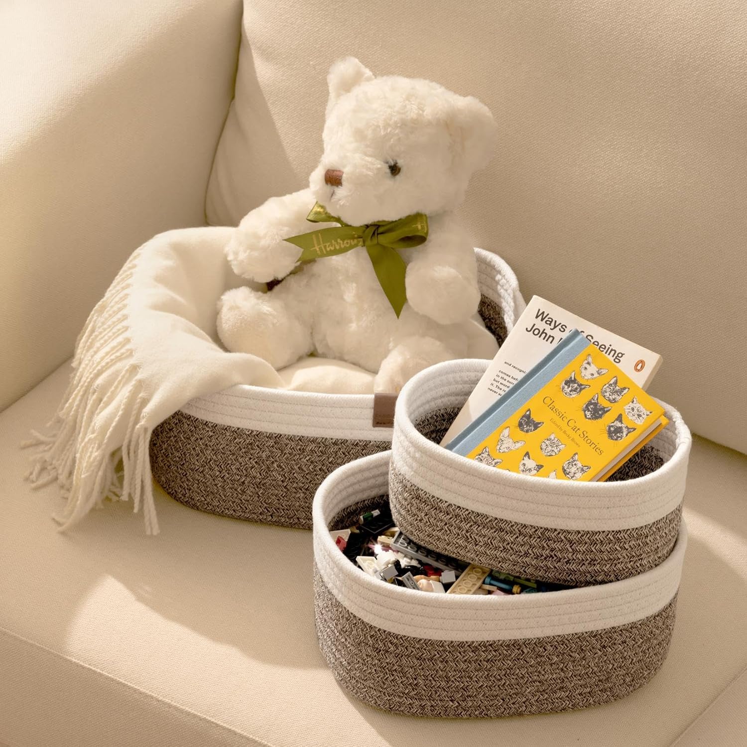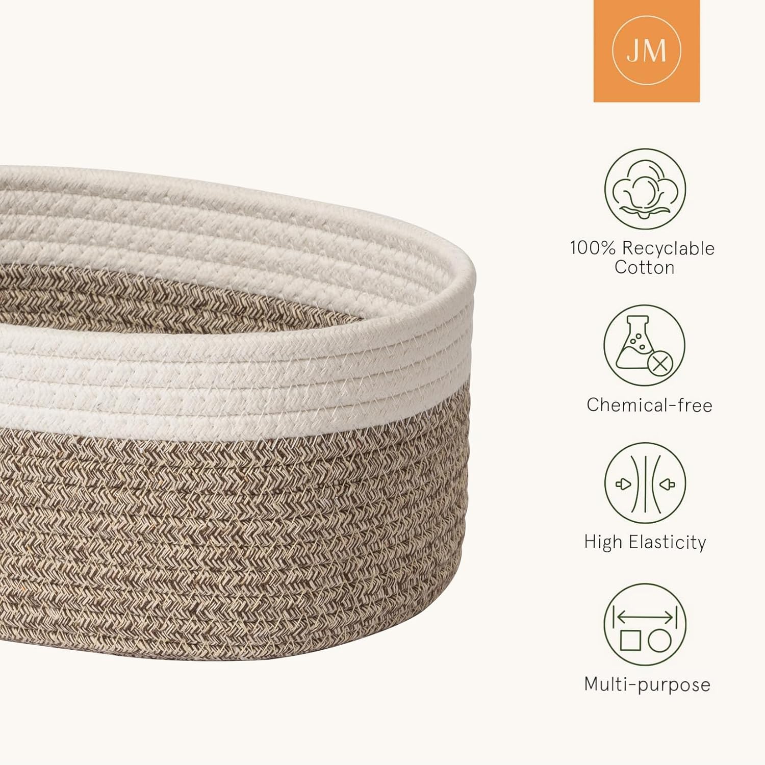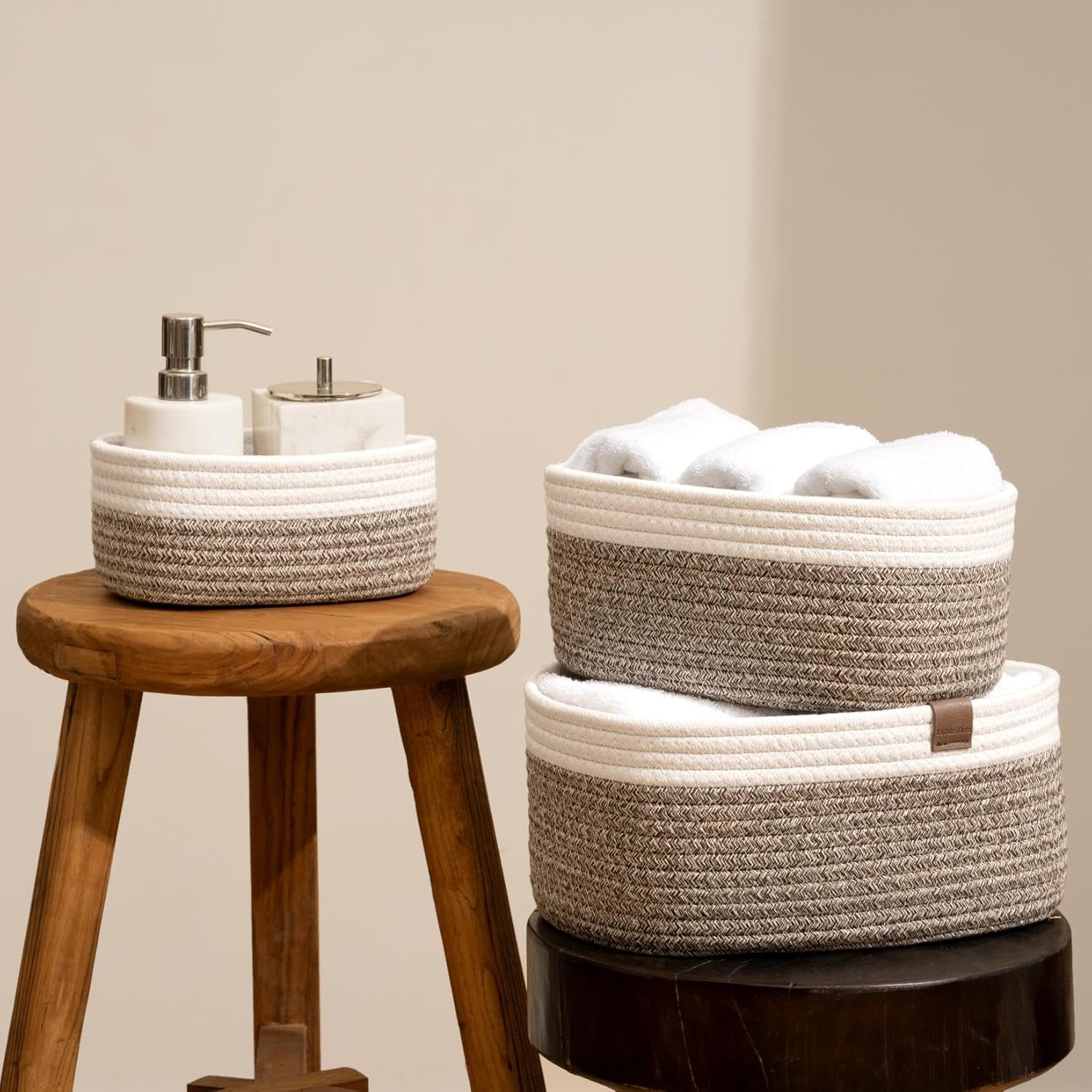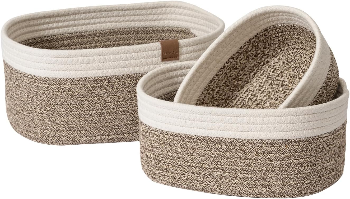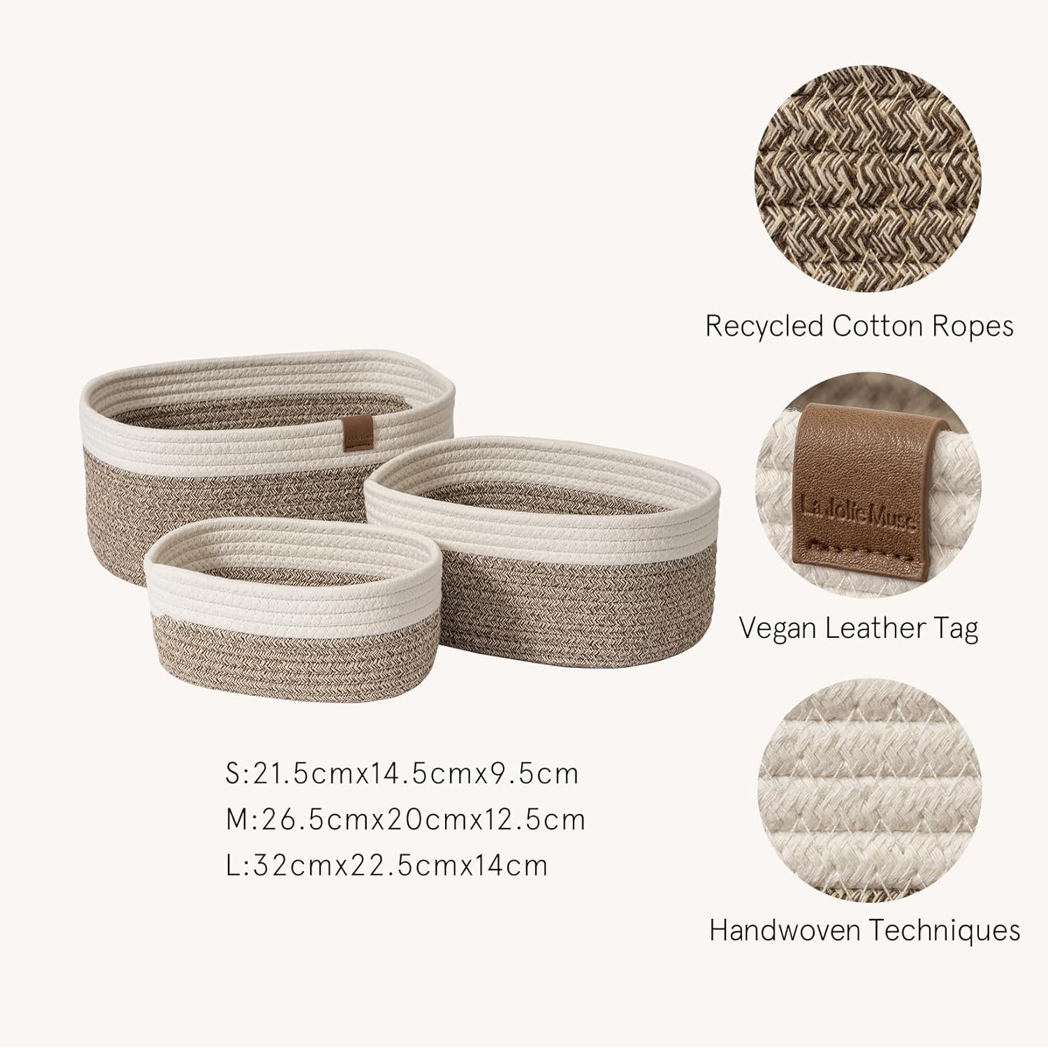 LA JOLIE MUSE Rope Storage Baskets for Organizing, Small Cotton Woven Basket for Bathroom Shelf Nursery, Decorative Basket Organizer Bins Set of 3, White & Brown