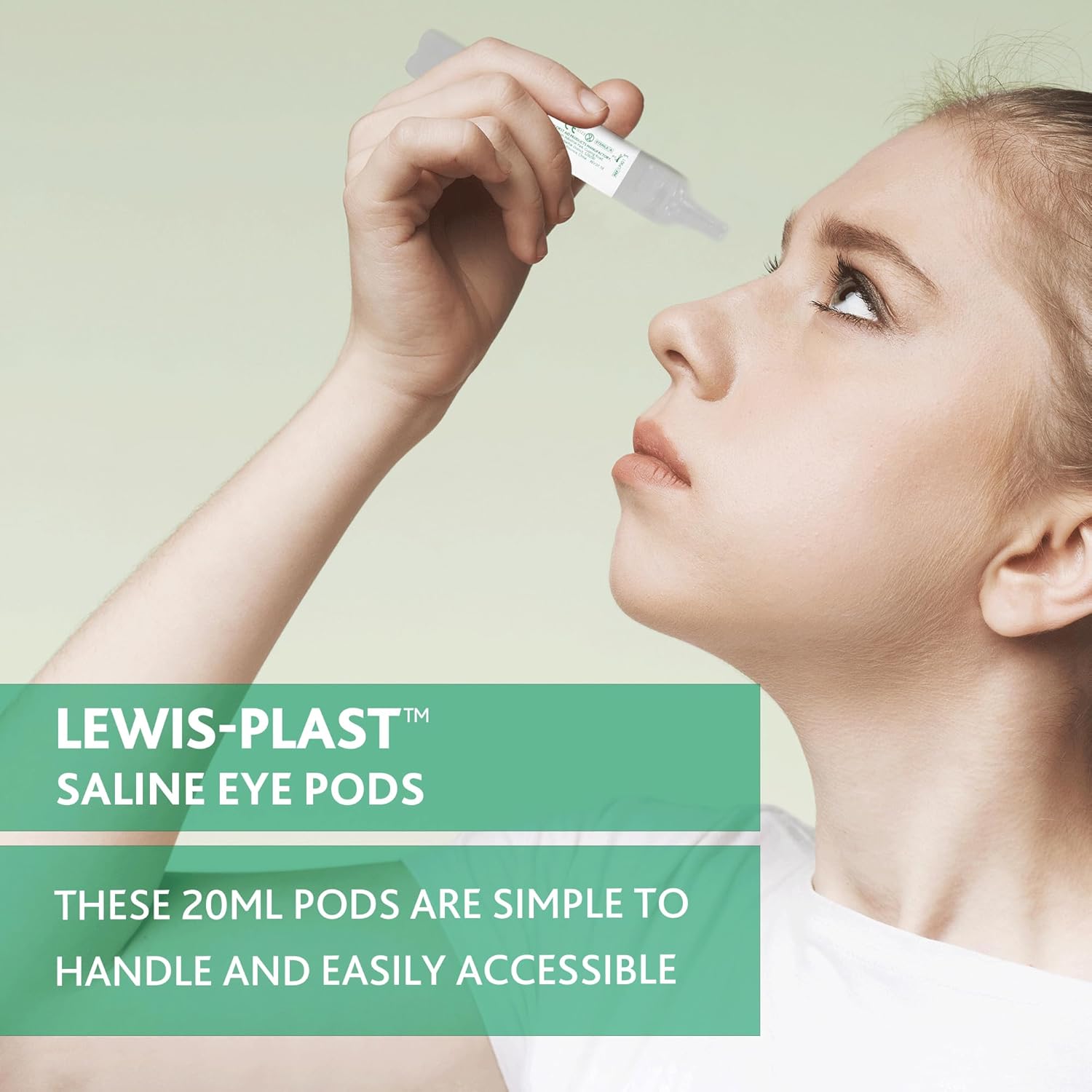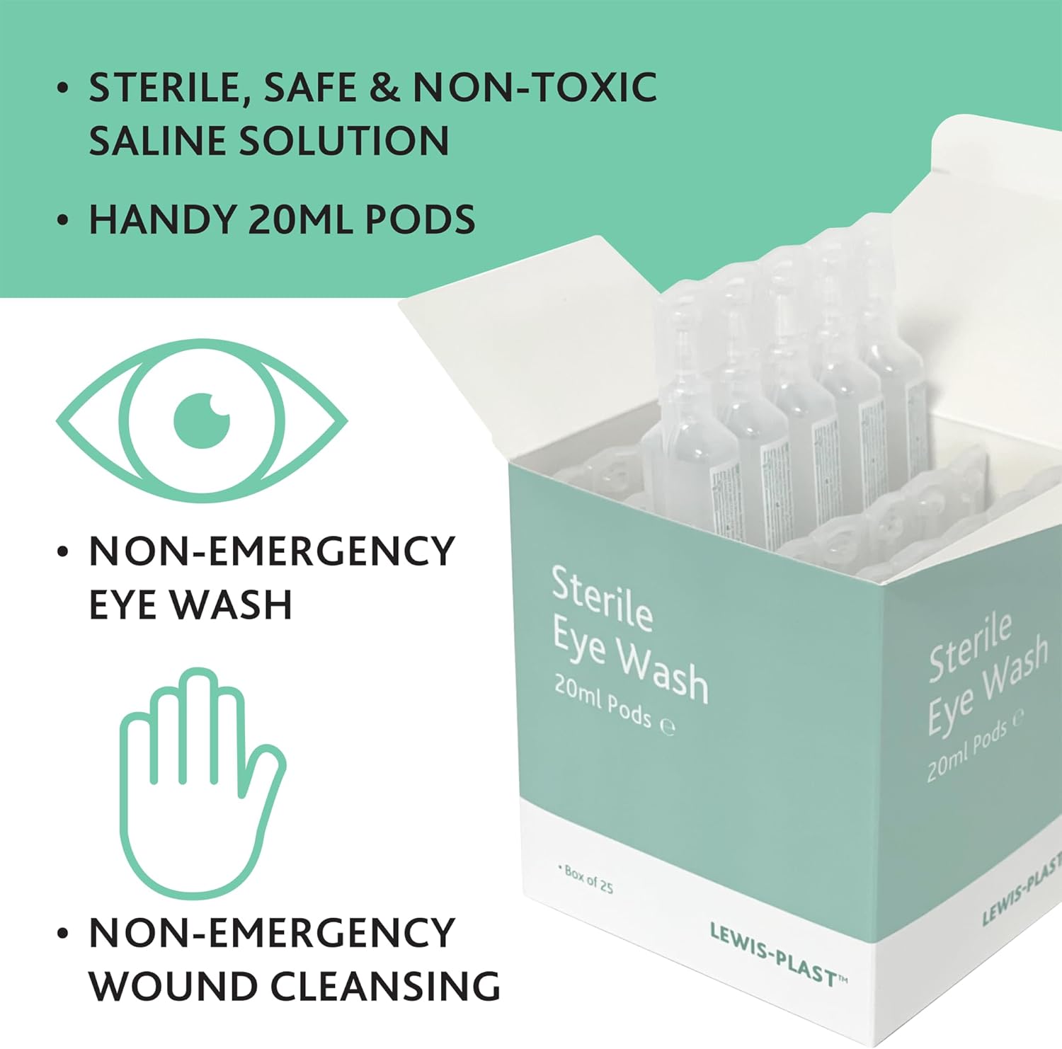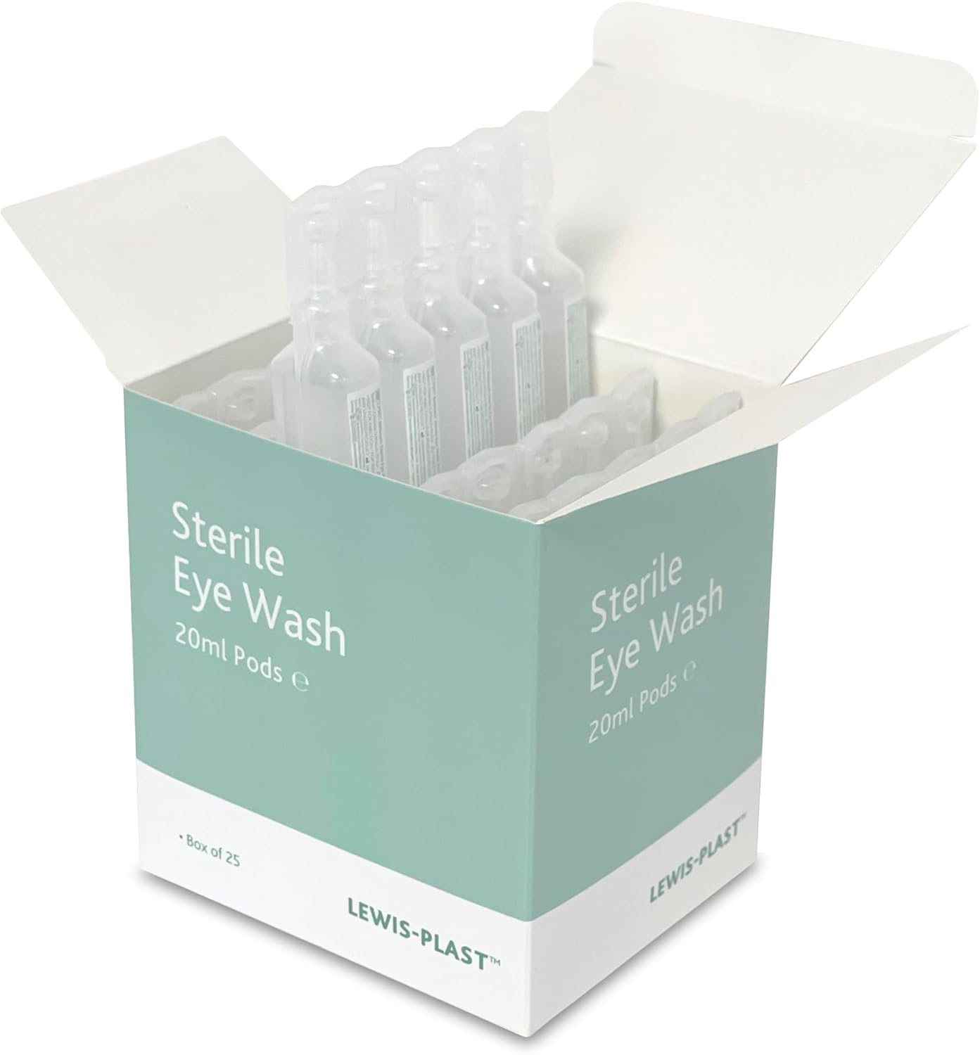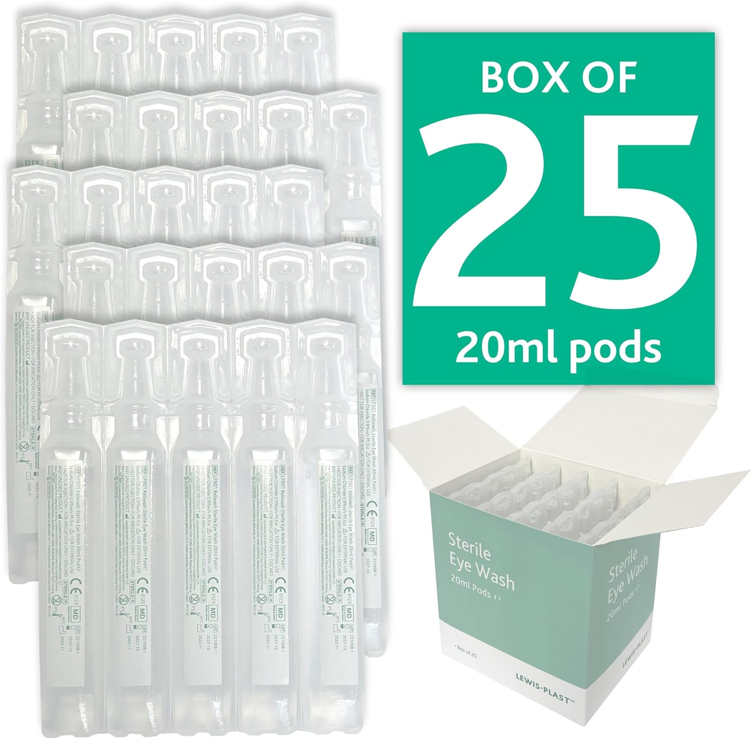 Lewis-Plast Premium 20ml Saline Eye Wash Pods Box of 25 – Contains Sodium Chloride 0.9% W/V Sterile Non-Toxic 20ml Pods for Minor Eye Irritation