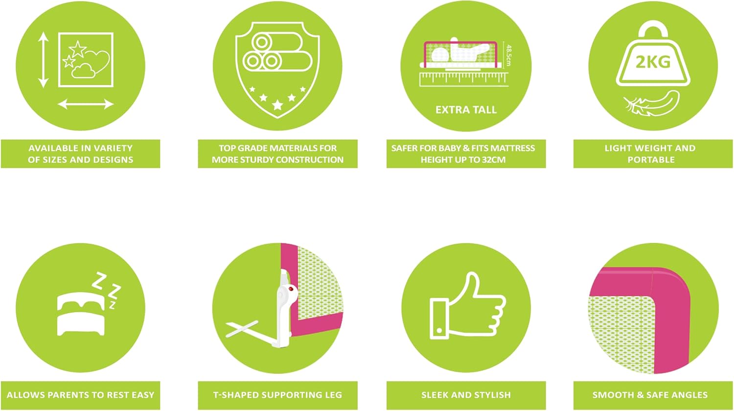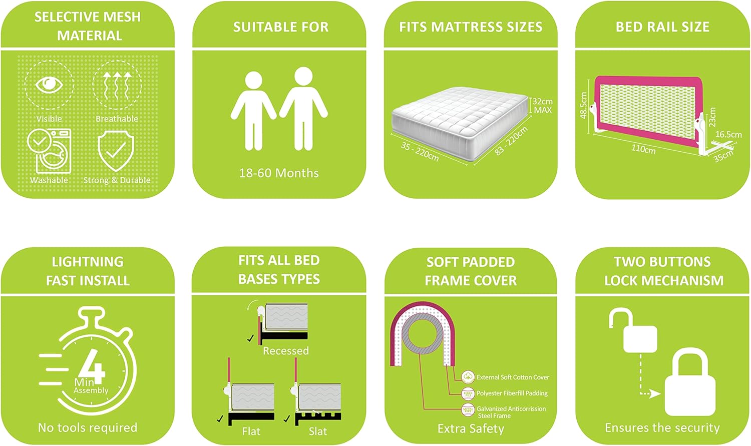 Soft padded frame for extra safety. Smooth & safe angles. Soft, visible, breathable, washable, strong & durable selective mesh material.