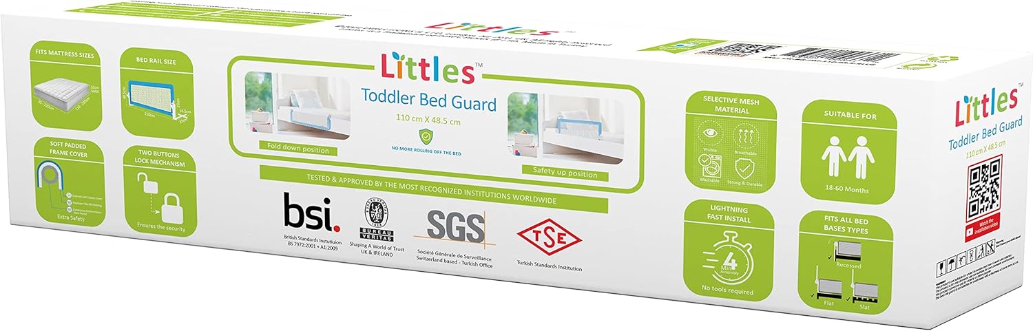 Littles Bed Guard measures 110cm L x 48.5cm H. Fits divan, box-spring, recessed, flat and slatted bed bases