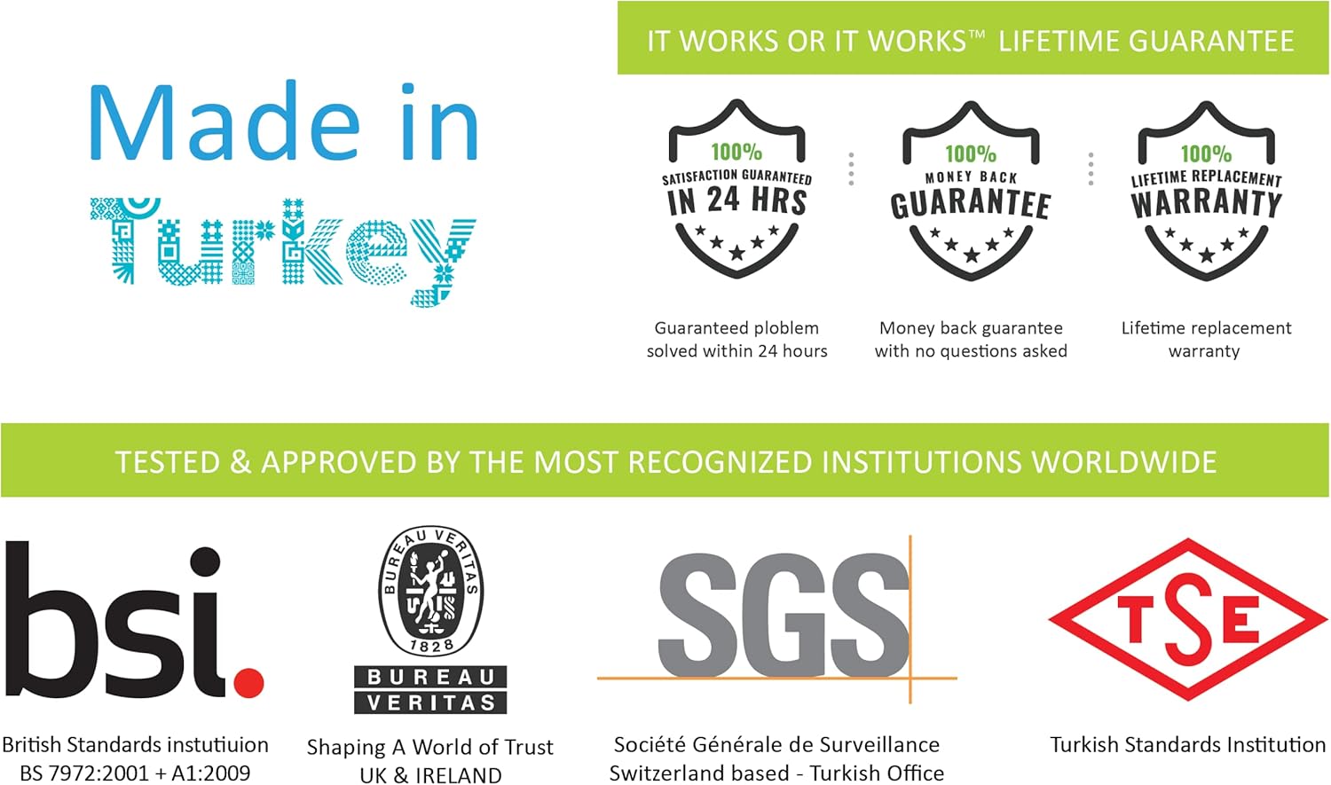 Lifetime guarantee. Tested and approved by the most recognized institutions worldwide including bsi & SGS. Made in Turkey.