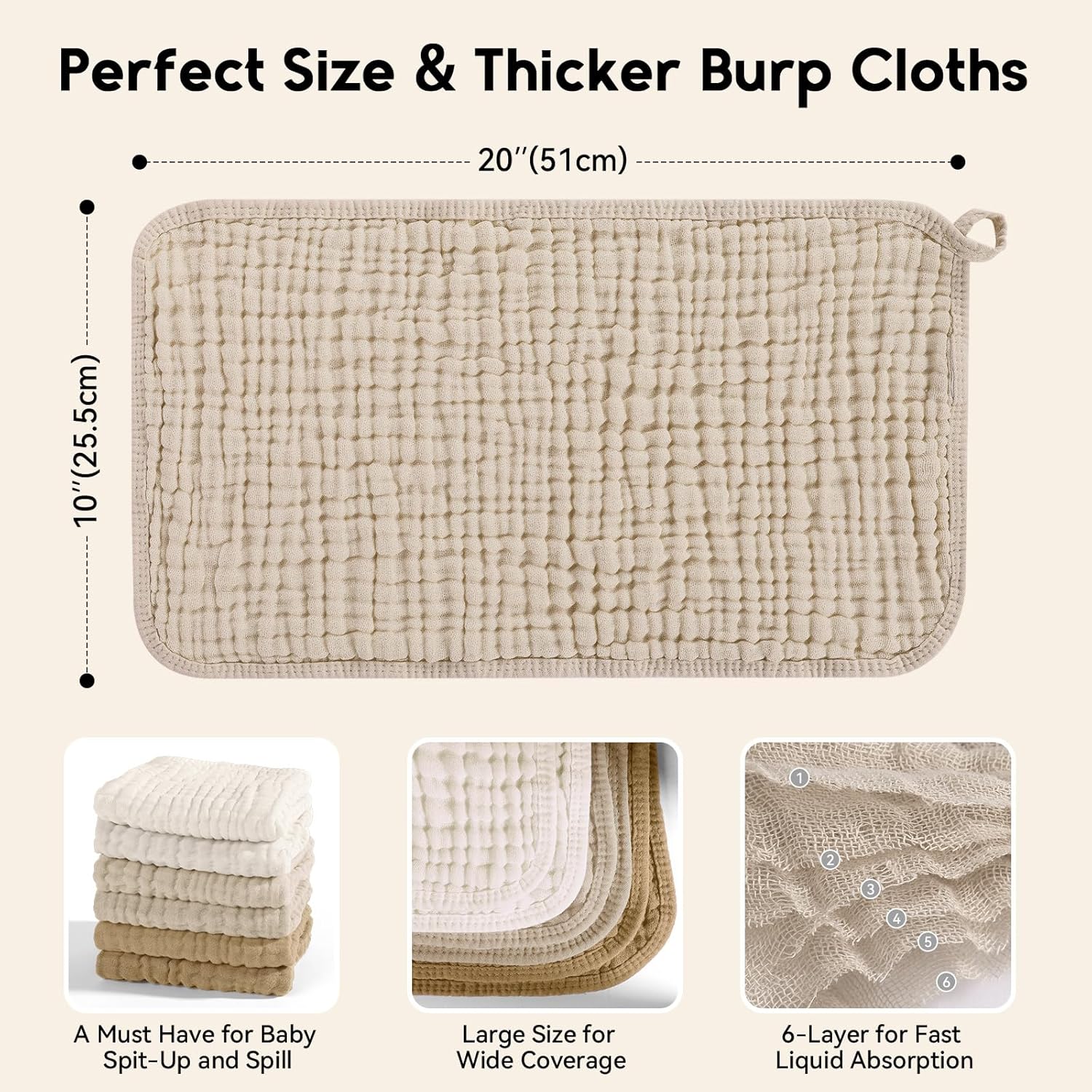 Excellent Absorbent: Featuring 6 layers of absorbent muslin and fluffy structure design, our muslin squares for babies provide maximum absorption with tendor touch, works well to protect your teething baby from all dribble and spit ups soaking their clothes. Large 50x25CM size provides maximum coverage and extra layering adds durability, making them ideal for use in any season.