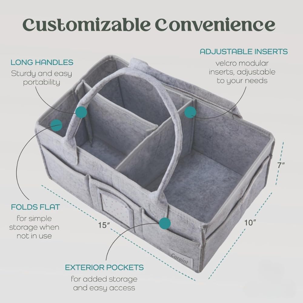 Baby Caddy with Handles and Removable Dividers – This nursery storage basket is equipped with sturdy and comfortable handles, allowing you to carry it effortlessly from room to room and onto car travel trips. The removable dividers provide flexibility in organizing the caddy according to your specific needs and keep it neat and organized