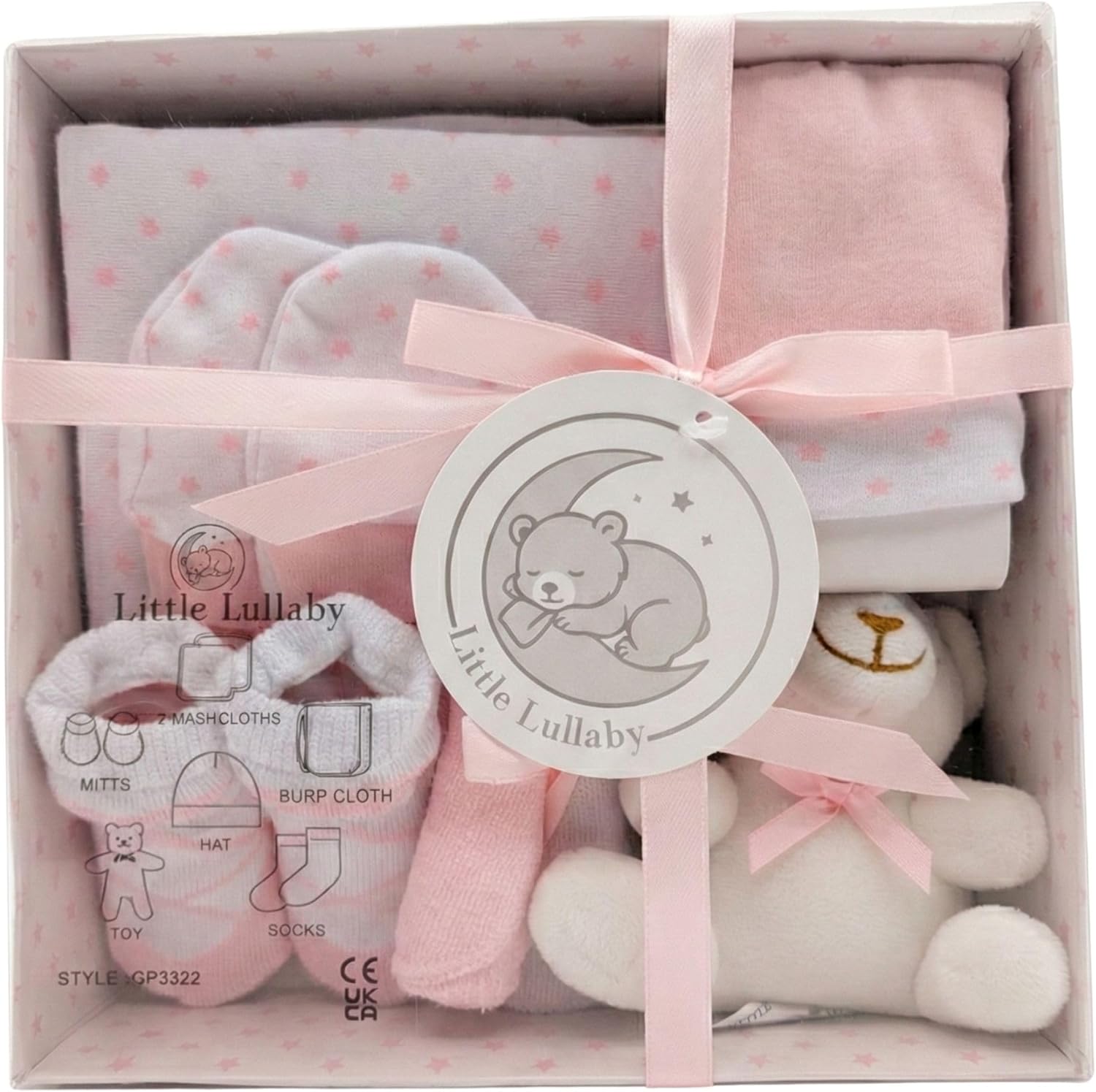 Newborn 7 Piece Luxury Boxed Baby Gift Set (0-3 Months) with Bundle Bear “Welcome Baby” Card, Baby Showers Gift & Newborn Baby Gift, Available in Blue, Pink & White (Pink)
