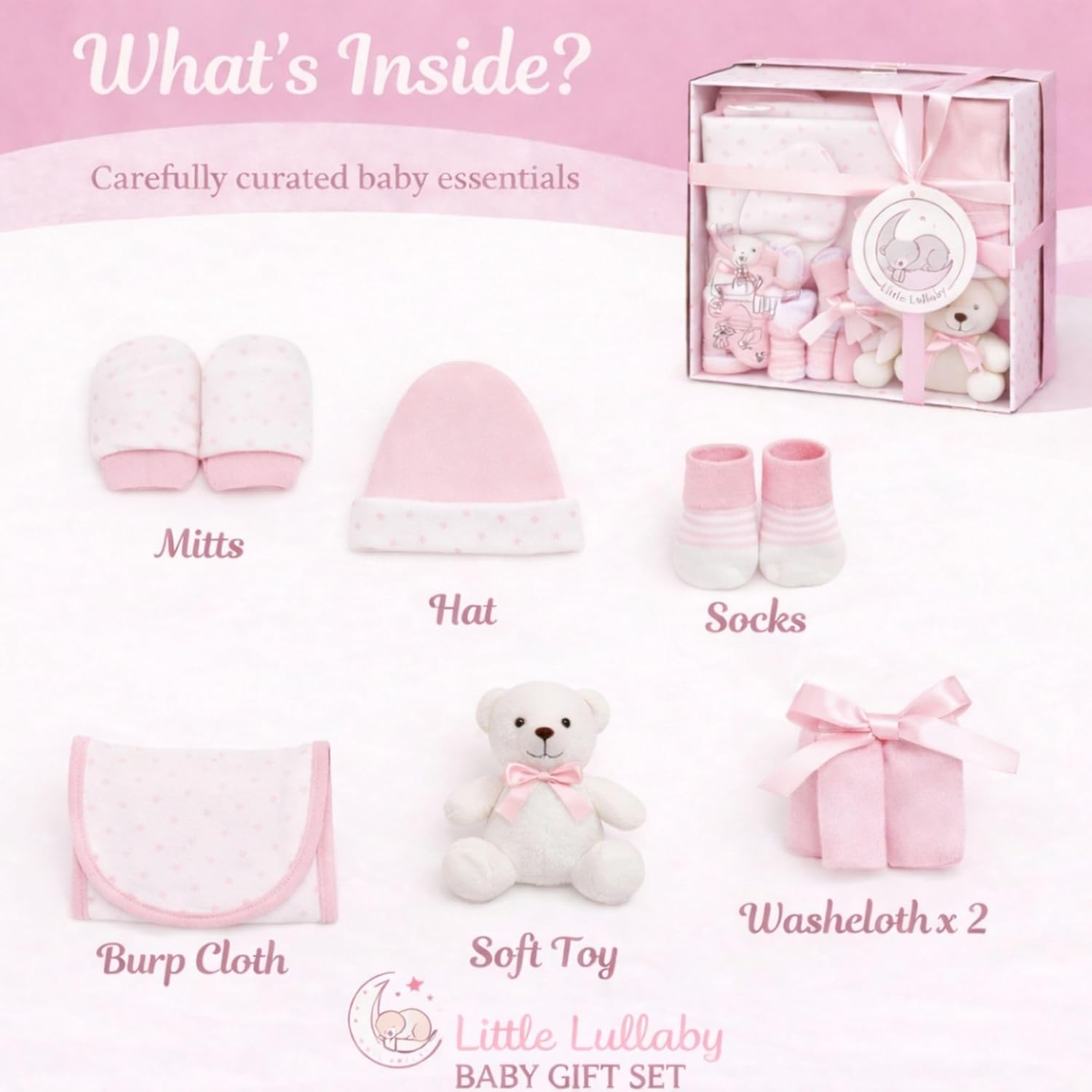 Baby Essentials for Newborn: Includes 7 high-quality items: 1 Teddy, 1 Hat, 1 Pair of Mittens, 2 Wash Cloths, 1 Pair of Socks, and 1 Burp Cloth. A must-have for newborn essentials.
