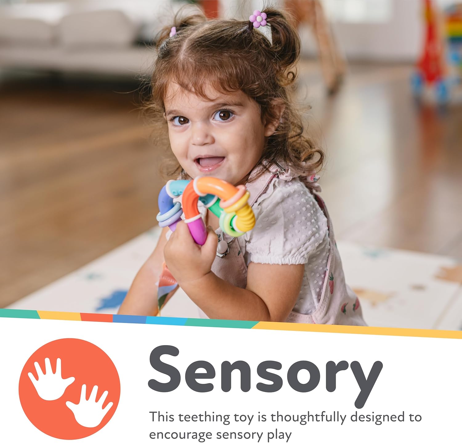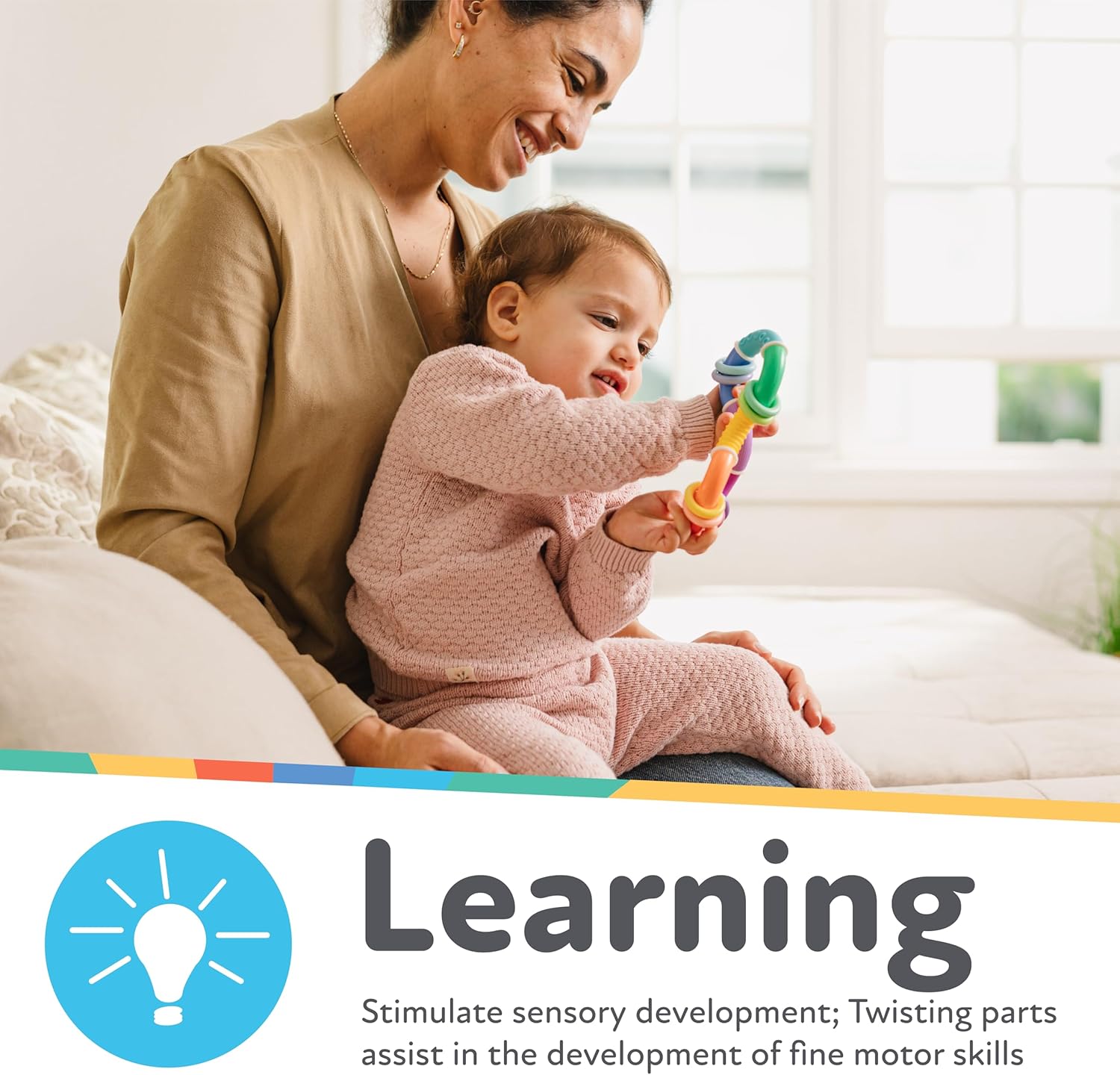 STIMULATES BABY’S SENSES Bright colors, fun rattle sounds and spinning parts together stimulate baby’s senses, while the rings provide extra tactile interest when exploring