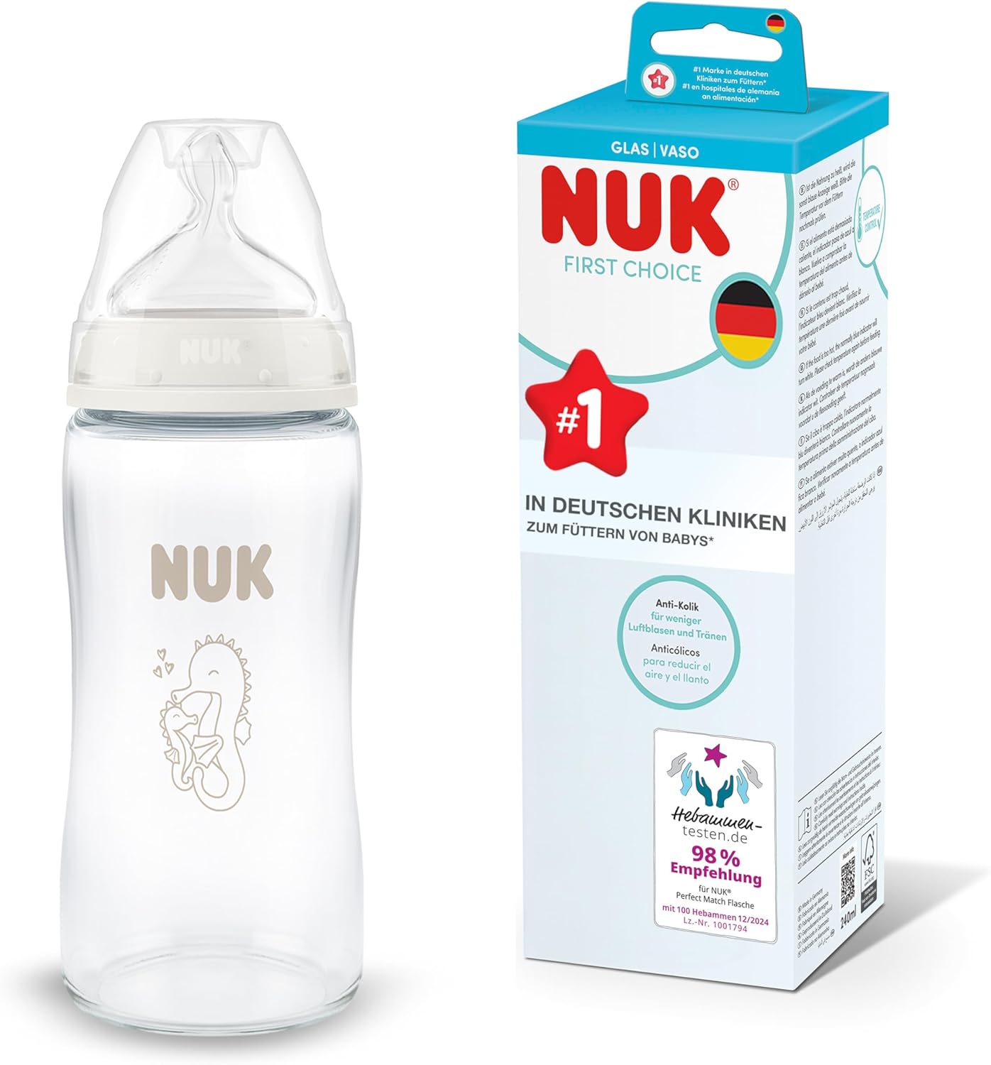 Nuk First Choice Baby Bottle | 3+ Months | 240ml | Anti-Colic Bottle | Glass | Temperature Indicator | Seahorse | 1 Unit