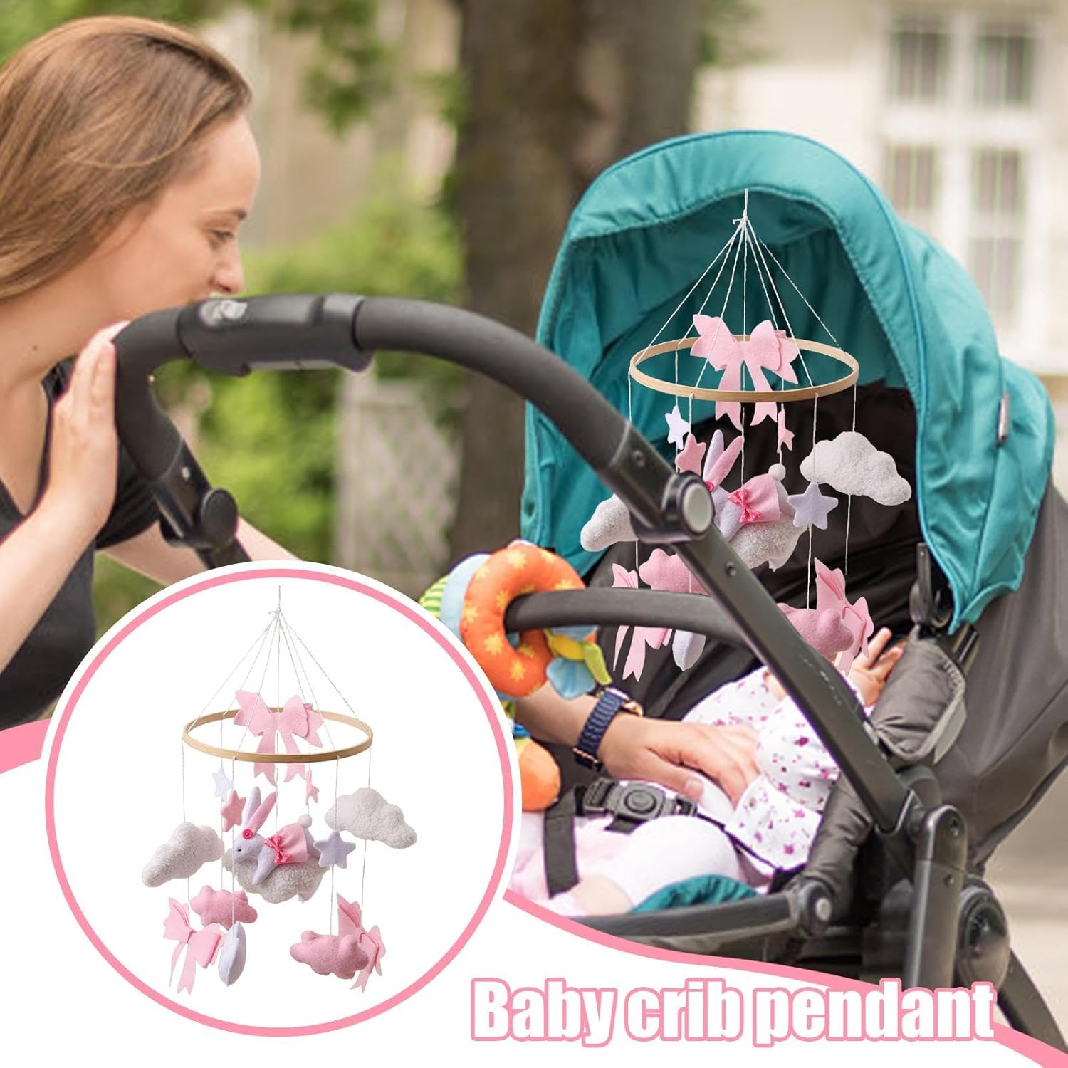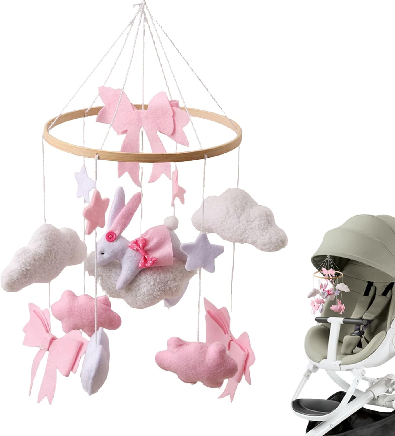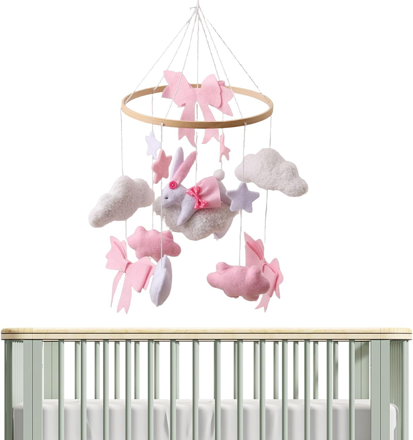 Nursery Mobile for Crib | Pink Bow Bunny Crib Mobile Decor – Boys Girls Rotating Sensory Toy Bohemian Ornament for Bedroom Bassinet Window Wall Living Room