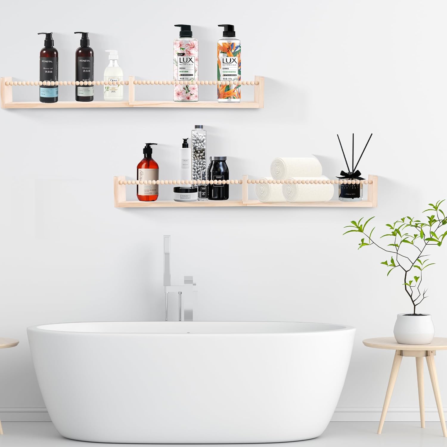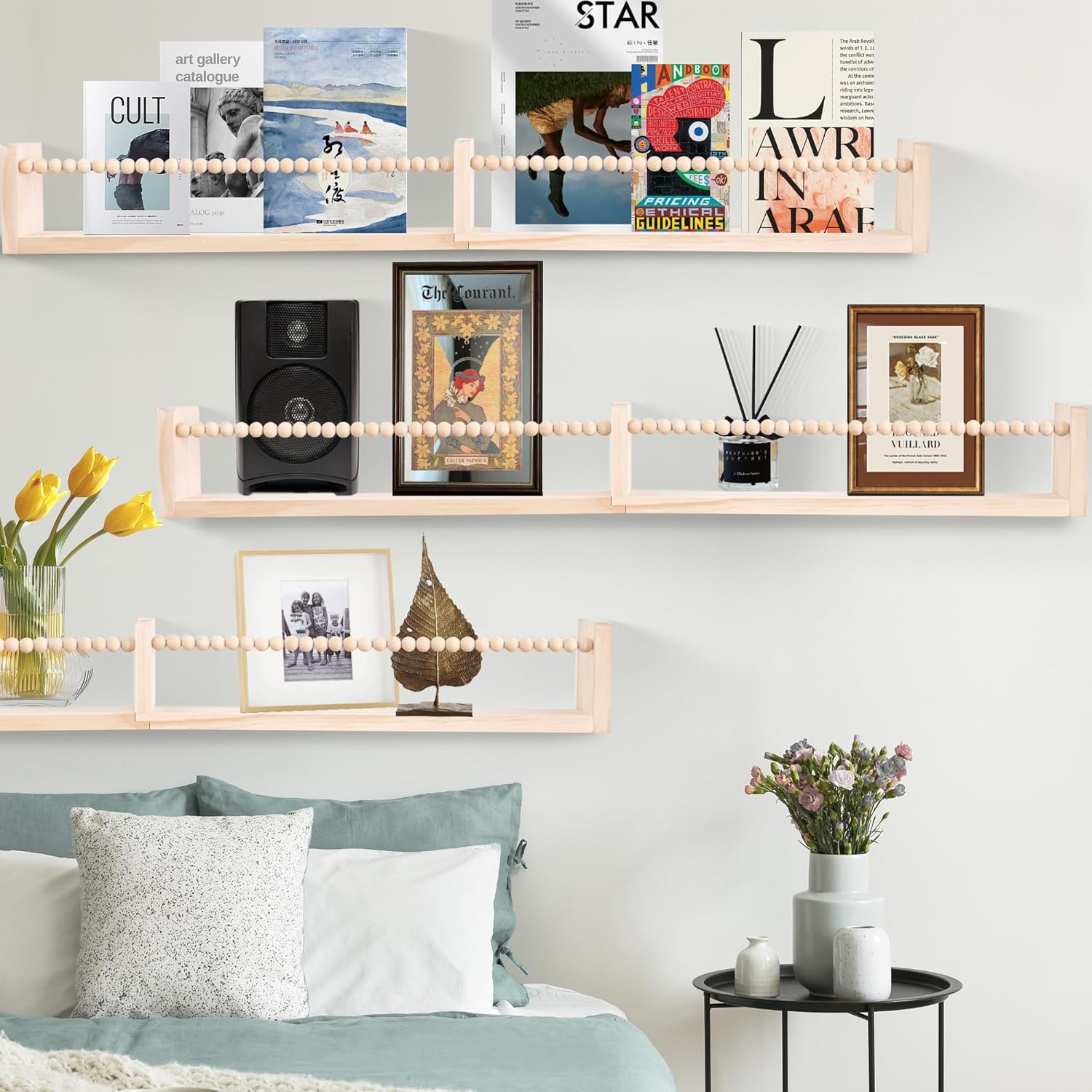 Classic Design:nursery floating shelves with wood beaded bar,it can be used updward prevent items from falling off.or upside down provide more storage space.In addition,small wooden stick also hang and organize baby clothes,towels,hair bands,etc.