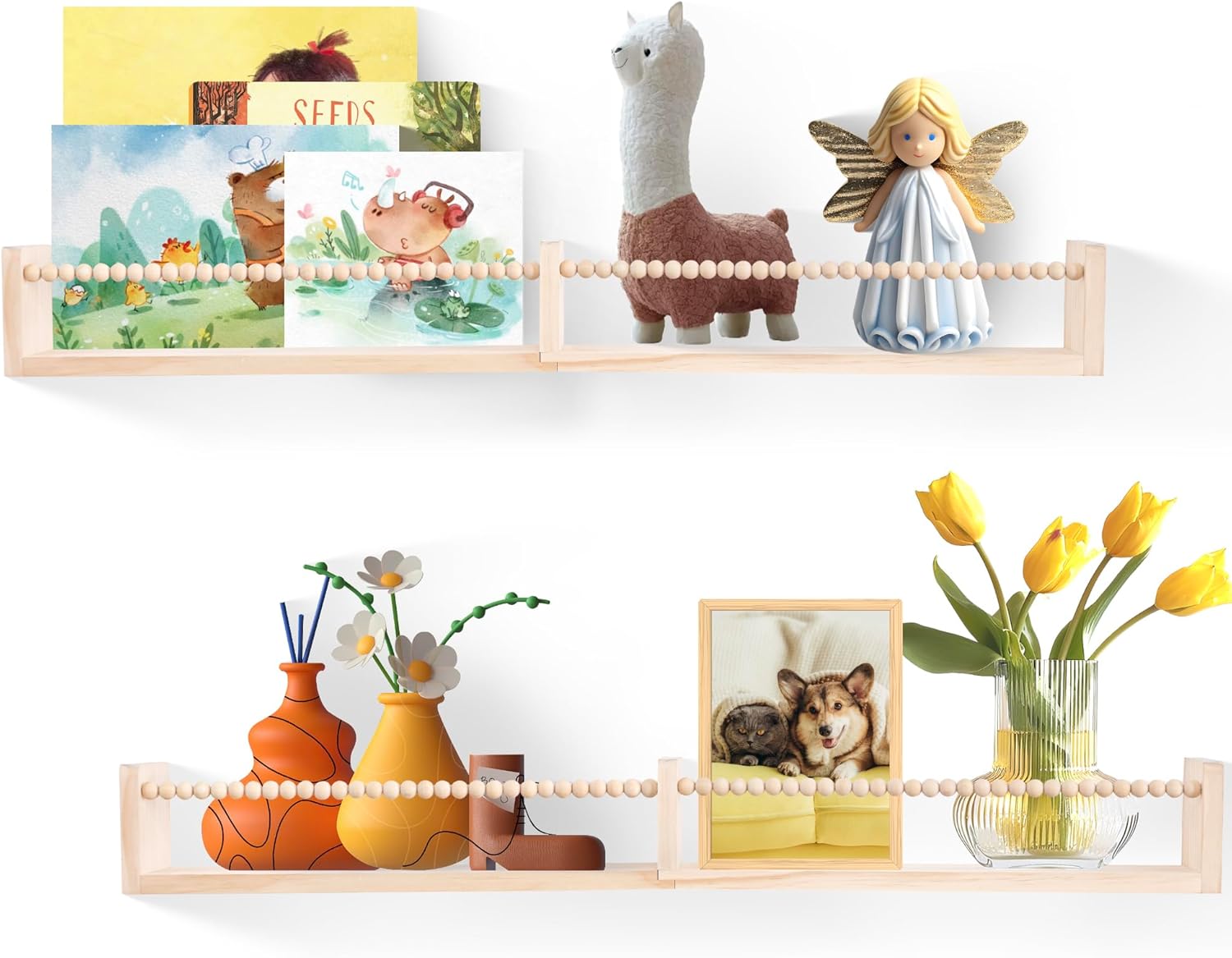 Nursery Shelves for Wall,Kids Bookshelves Set of 2,Floating Bookshelf Baby Book Toy Display Storage Organizer Decor with Wooden Beads Bar,Preassembled,Natural Pine Wood,81.5CM