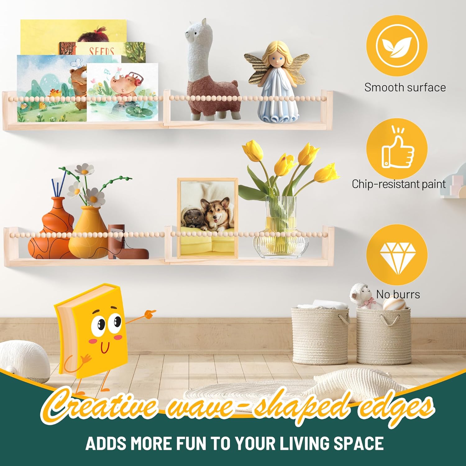 Premium Material:kids wall bookshelf are built with sturdy and stable solid pine wood ,the surface smooth no burrs and odor, and corners are designed with circular arcs to avoid collisions and provide more protection for children