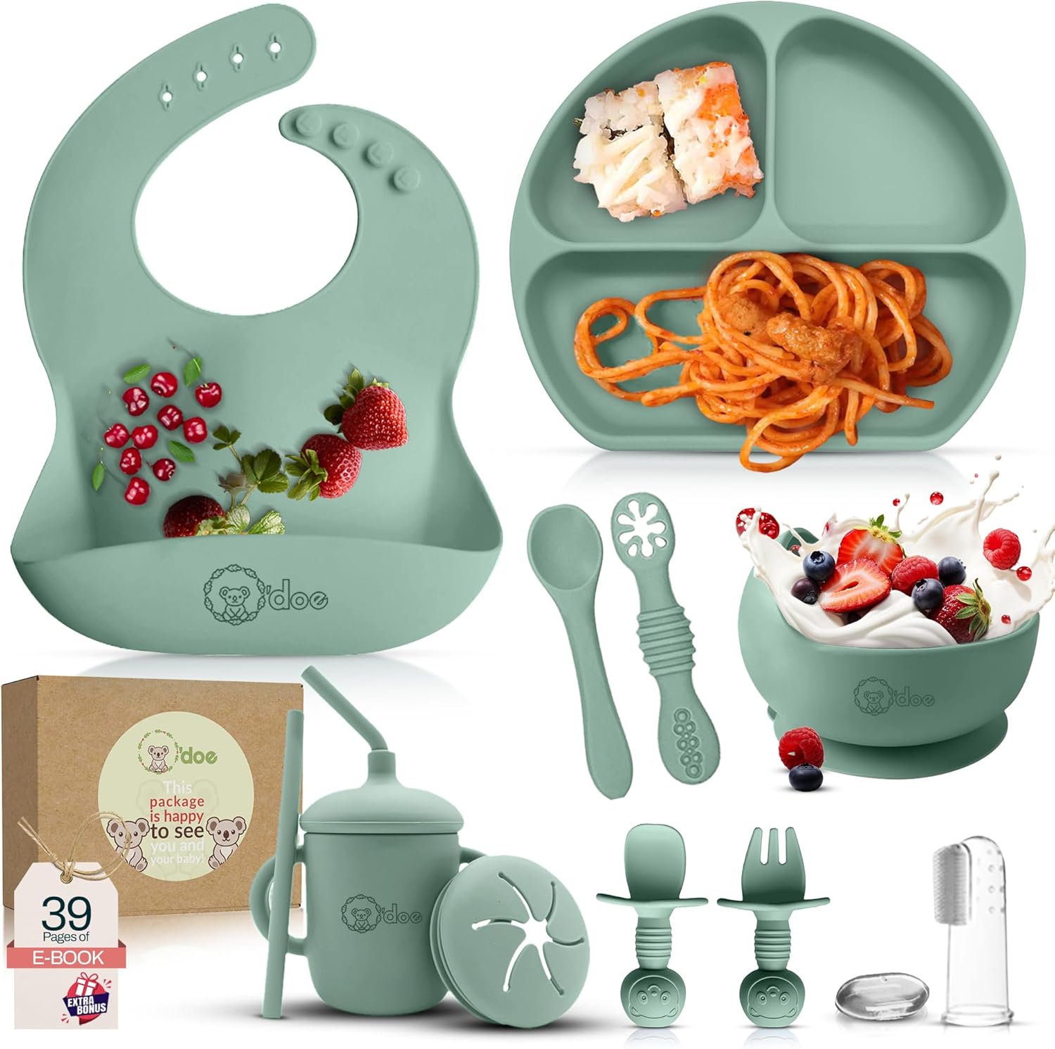 & Free Shipping𝐒𝐄𝐋𝐅 𝐅𝐄𝐄𝐃𝐈𝐍𝐆 𝐒𝐄𝐓: BLW E-book | 11-piece baby feeding set contains 1 x baby suction plate, 1 x suction bowl, 1 x toddler spoon, 1 x sippy cup, 1 x sippy cup straw with lid, 1 x snack cup lid, 1 x baby bib with catcher, 1 x first stage toddler fork, 1 x first stage toddler spoon, 1 x weaning spoon, and 1 x finger toothbrush cover. Designed to cater to all your baby’s mealtime needs.