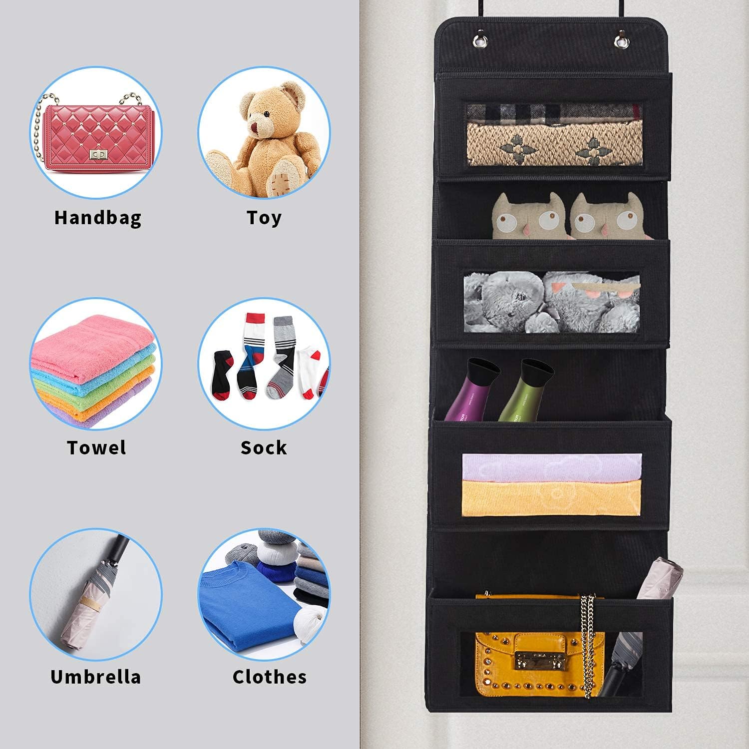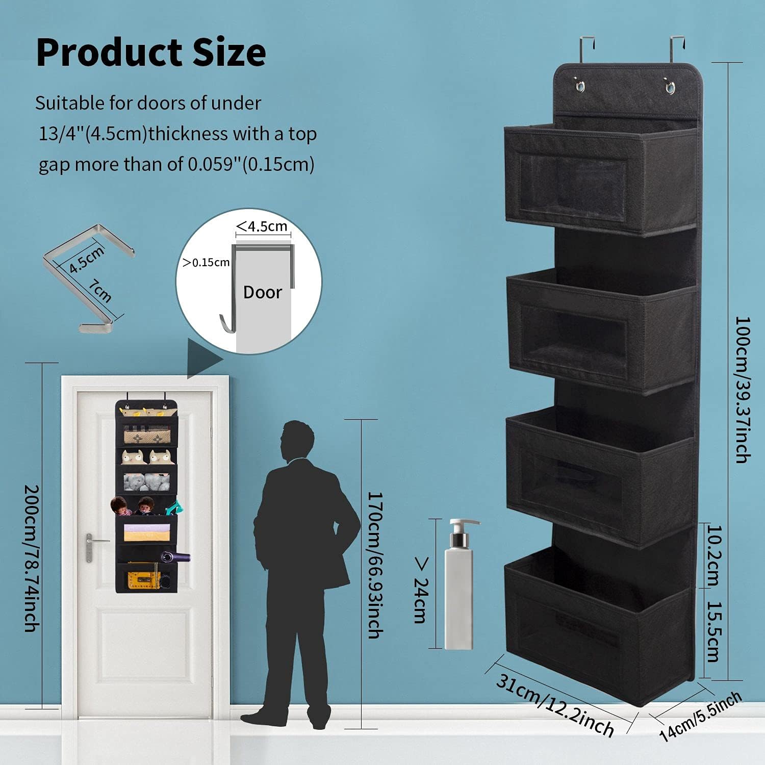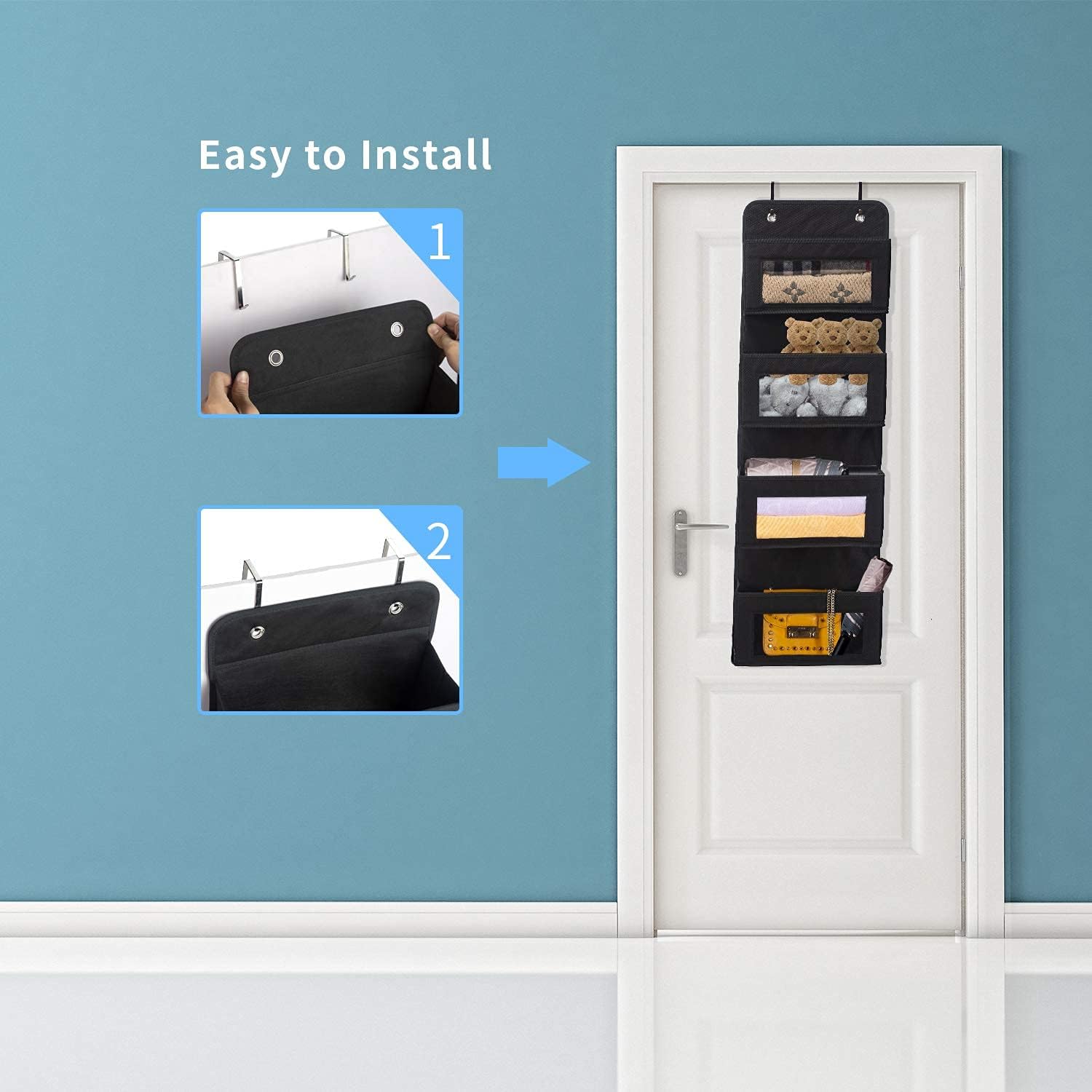 HIGH QUALITY MATERIALS: Thickened and sturdy material is Non-toxic, and strongly wear-resistant, promise you and your family safe and harmless with good quality. It comes with 2 L-shape hooks for hanging the organizer onto frames or doors (suitable for 1. 77 in thick standard home-use door).