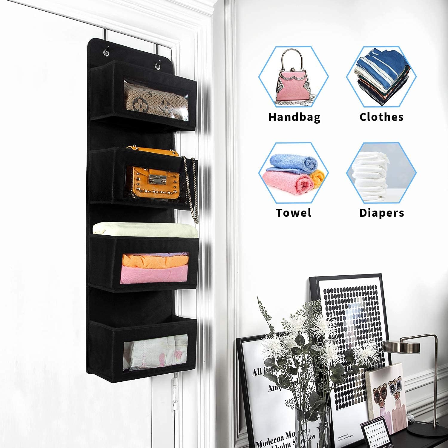 Over Door Storage Organiser, Soft Fabric Hanging Storage Organizer with Clear Window for Pantry Baby Nursery Bathroom Closet Dorm Room 4 Pockets, Black