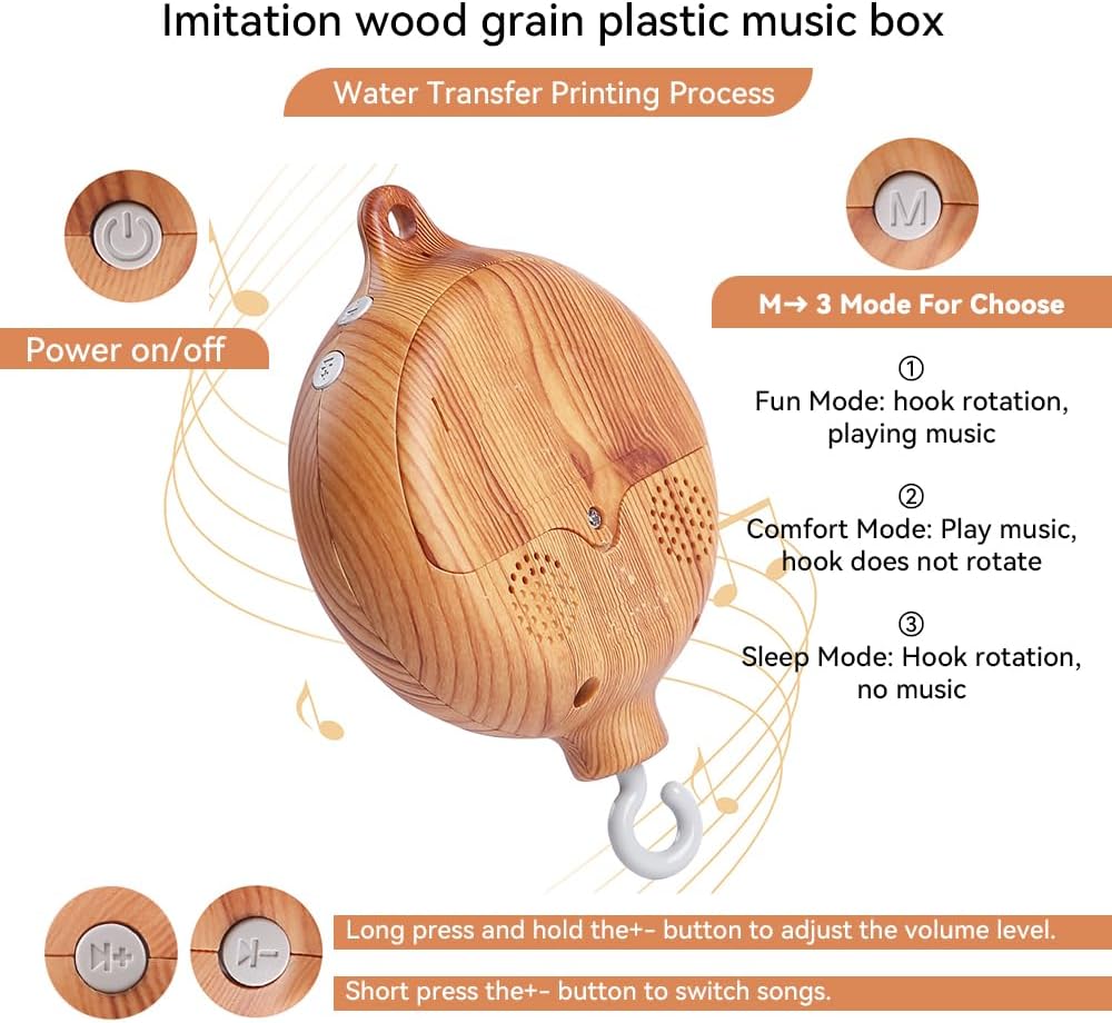 👶❤ 【Water Transfer Tech Wood Pattern Hanging Mobile】*: Music box does not contain batteries. Please see installation pictures, instructions to learn. ❤ M key → 3-mode to choose from,Fun mode: hook rotation, play music. Comfort mode: Play music, hook does not rotate. Sleep mode: hook rotation, no music, ❤ ○ Button → Power on/off. ❤ Long press and hold +- key to adjust volume ❤ Press briefly short +- key to switch songs. ❤ Chosse, M,Sleep/ Fun Mode,Mobile Toys with Hook rotatable.