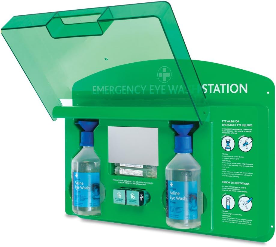 & Free ShippingAdvanced Emergency Preparedness: Robust eye wash station crafted from durable ABS plastic, designed to provide immediate response in eye emergencies; Includes 2 Dressings, Eye Pad 2 Eye Wash, Bottles 500ml 5 Eye Wash, Pods 20ml 1 Mirror