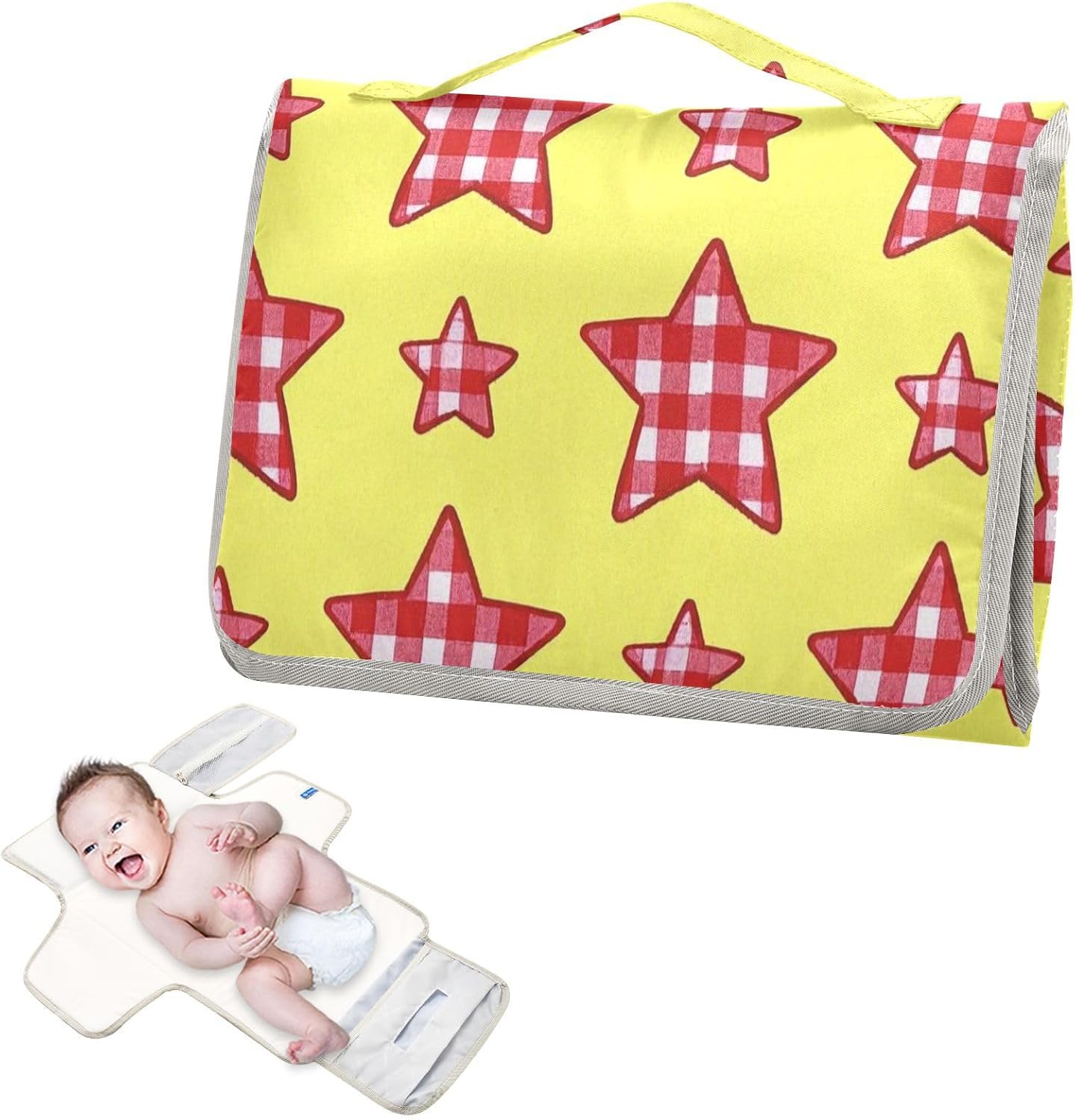 reusable cartoon checkered yellow and red stars pattern pads with tissue pocket changing pad for baby baby travel station kitReusable Cartoon Checkered Yellow and Red Stars Pattern Pads with Tissue Pocket Changing Pad for Baby Baby Travel Station Kit