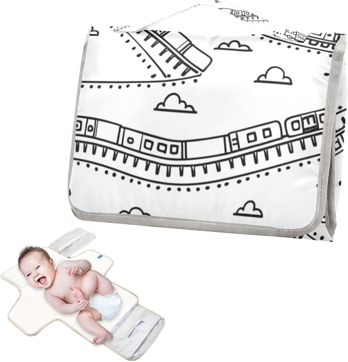 Reusable Diaper pad with Tissue Pocket Waterproof Changing pad for Baby Infant Travel Station Kit Black Simple Line Train