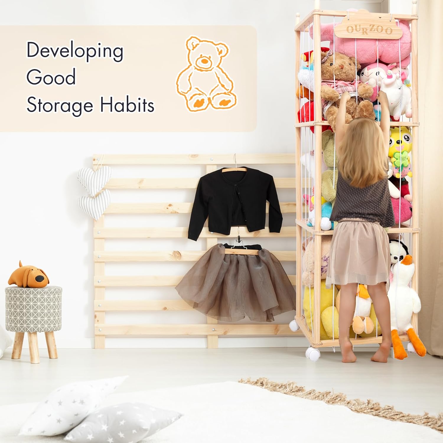 【Wooden Construction】: Stuffed animal storage made from wood and friendly cords to withstand daily use and the weight of multiple toys, providing a sturdy and stylish look that complements any room decor