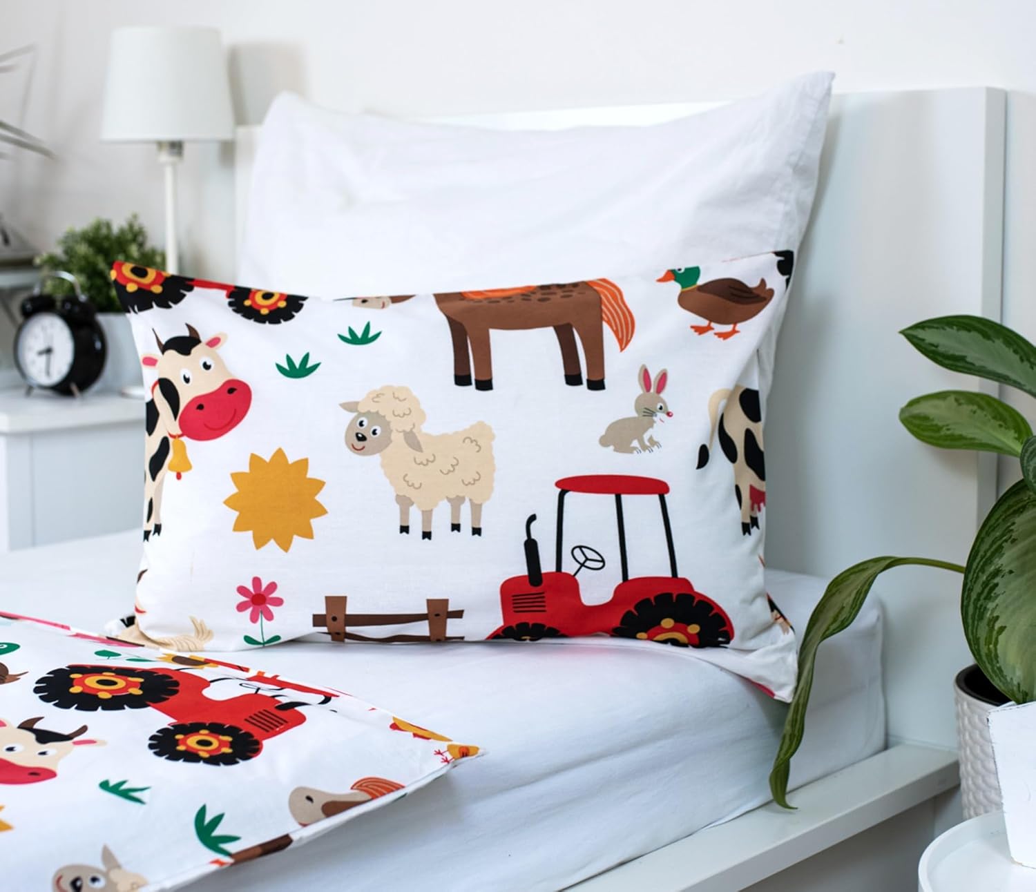 Theonoi Children’s Bed Linen 100 x 135 + 40 x 60 cm, 2-Piece Set Consisting of Duvet Cover and Pillowcase for Baby and Toddler Bed, 100% Cotton, Oeko-Tex, Reversible Animals & Tractor Motif