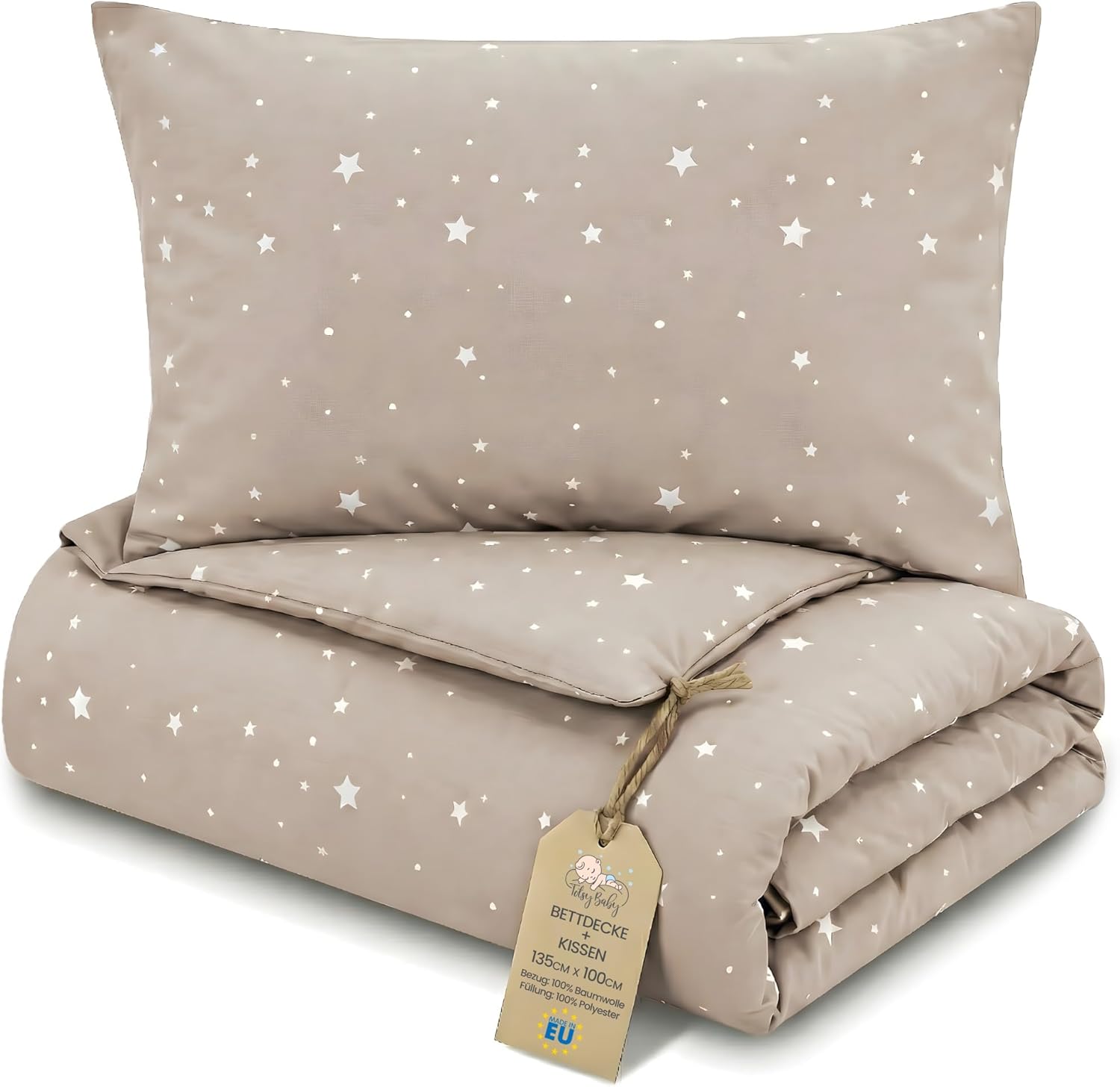 Toddler Duvet Pillow Set 100×135 cm Quilt 40×60 cm Cushion – Coton Lightweight Breathable Bedding Insert for Cot Nursery Travel Cots bed Insert Only 100 x 135 Oeko-tex Beige with white stars